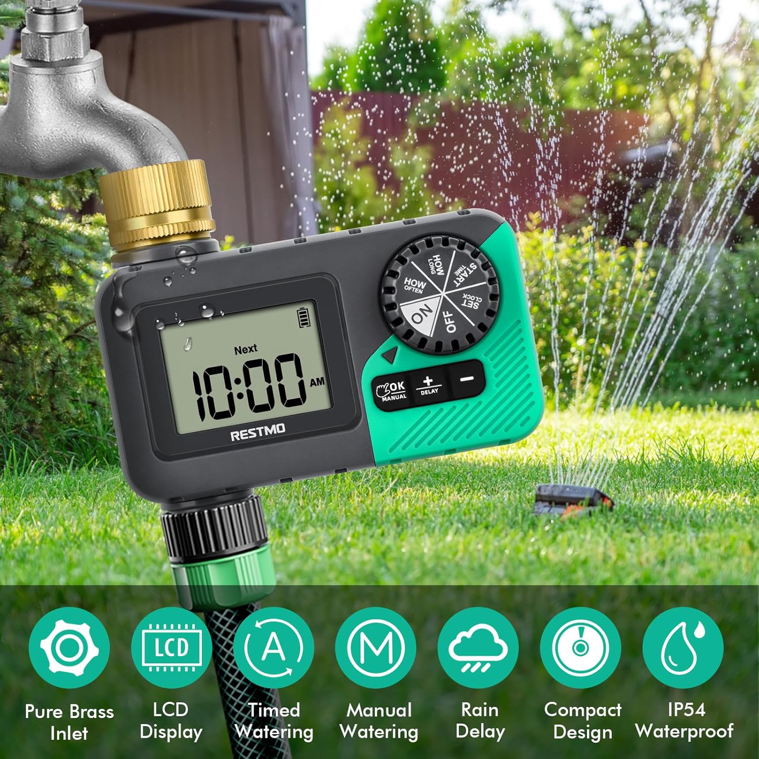RESTMO Sprinkler Timer with Brass Inlet, Water Timer for Garden Hose, Rain Delay/Manual/Automatic for Outdoor Faucet, Drip Irrigation and Lawn Watering System