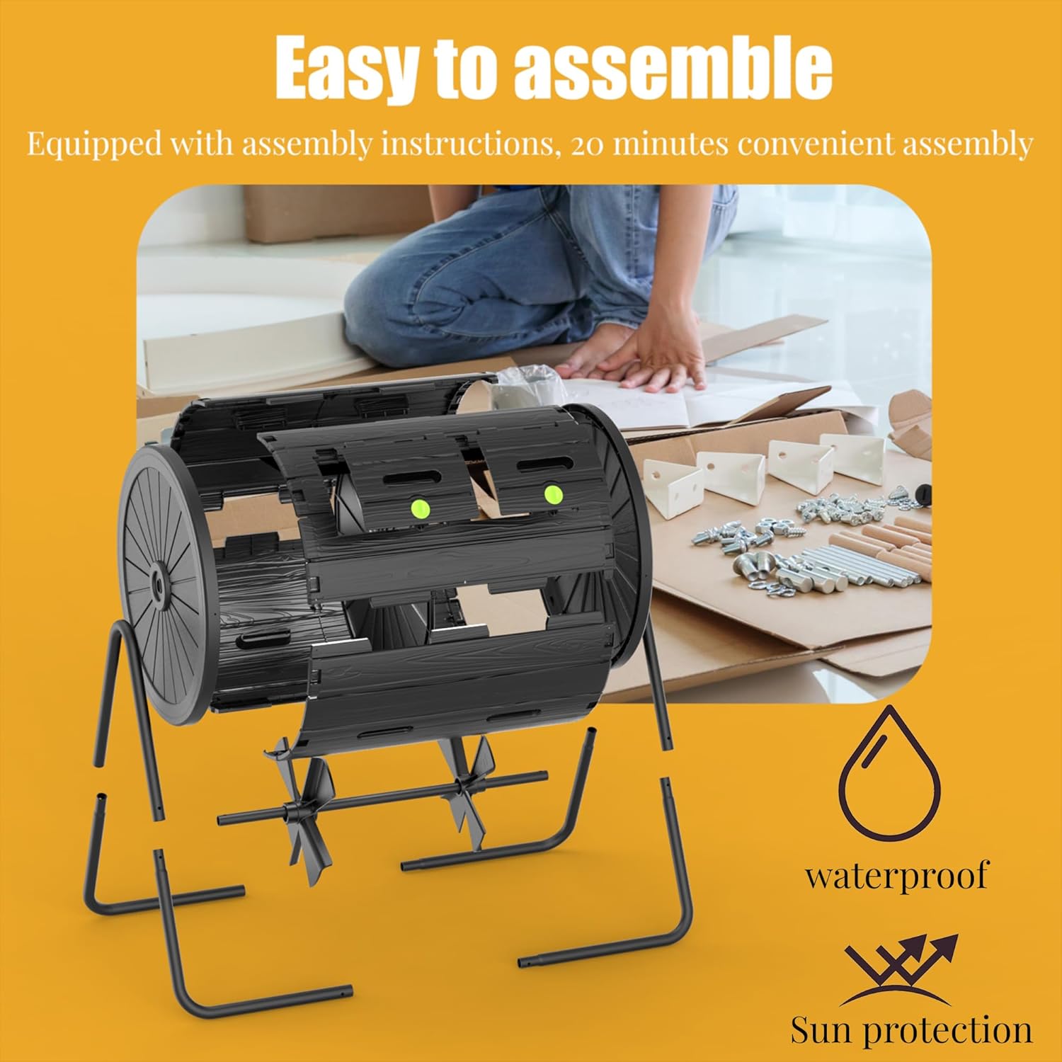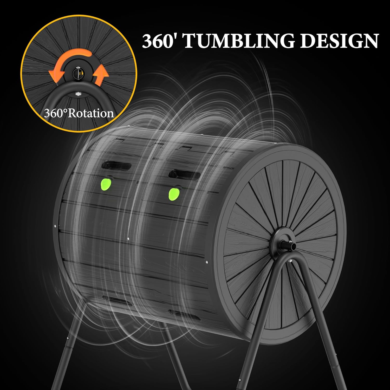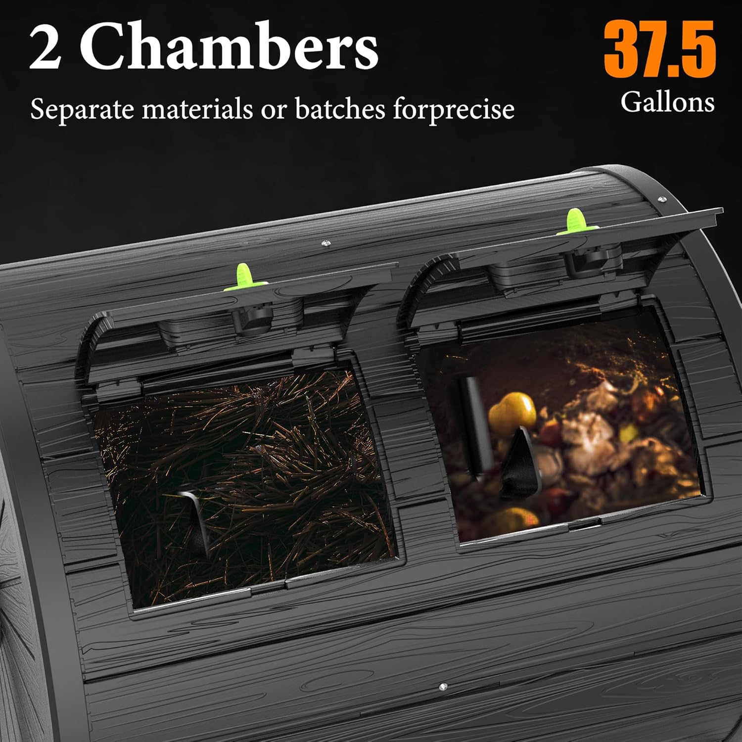 - Large Dual Chamber Design - Features a 37.5-gallon capacity with two independent chambers, allowing one side to complete composting while the other collects fresh scraps and yard waste. This alternating system ensures a continuous supply of nutrient-rich compost for your garden.