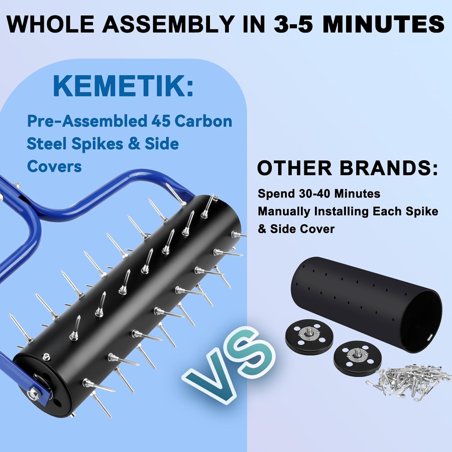 - Ready-to-Use Lawn Aerator – No Assembly Needed: KEMETIK lawn aerator tool features a 21" stainless steel roller with pre-installed 2" steel spikes! The 75" handle connects instantly. Simply roll to improve airflow, water absorption, and nutrient.