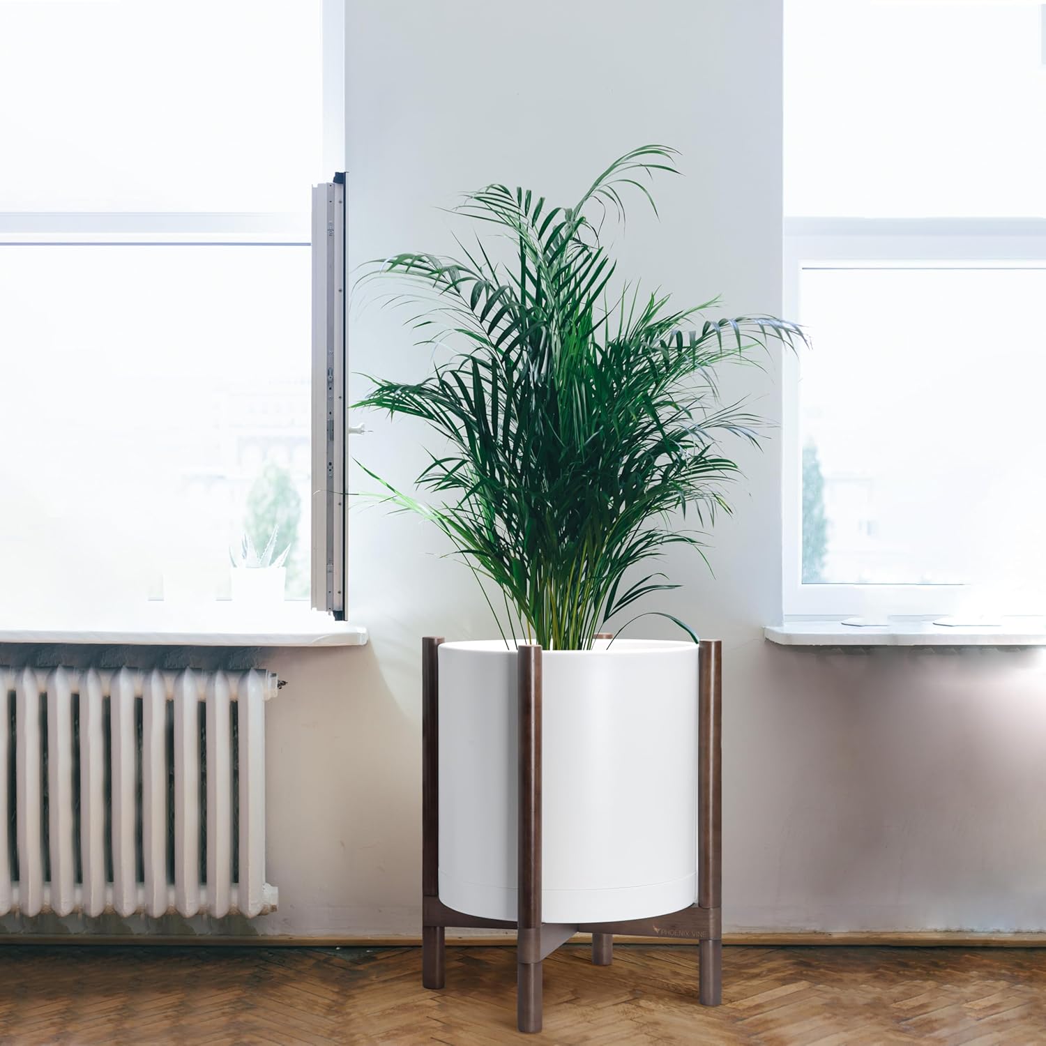 D'vine Dev Planter Pot with Stand - 16 Inch Plastic Cylinder Flower Pot with Wood Planter Holder for Indoor, Matte White Pot + Walnut Color Stand, 55-C-X-1