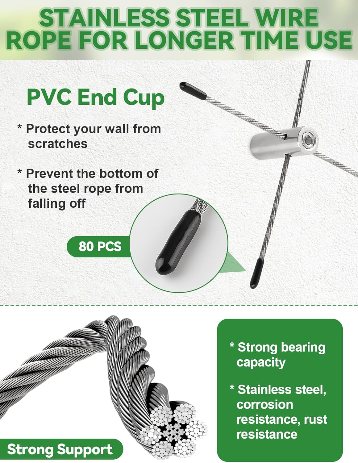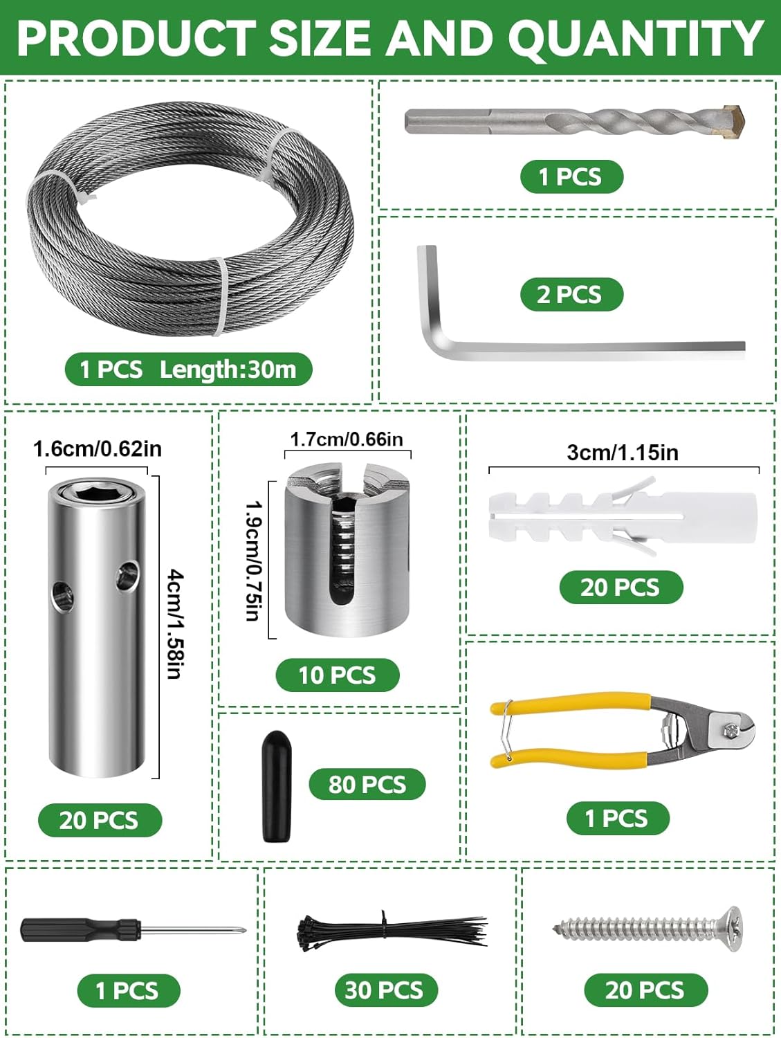 - What You Will Get: 20PCS Classic Heavy-Duty cylindrical standoffs, 100ft x 1/8in wire rope, 10PCS cross cable clamps, 20PCS screws, 20PCS plastic expansion anchors, 30PCS plant ties, 80PCS PVC end caps, 1PCS screw driver, 2pcs all-purpose spanner, 1PCS matching drill bit, 1PCS cord cutter(The color is random.) and 1PCS instruction manual.