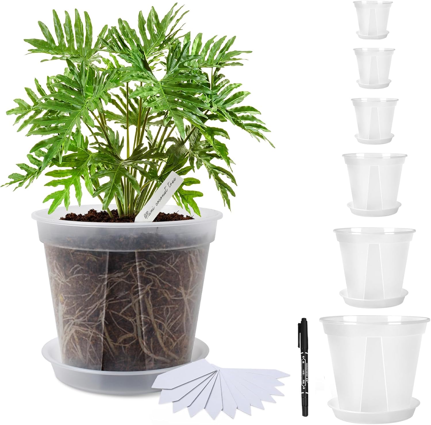 Transparent Plants Nursery Pots with Tray 4/5/5.5/6/7/8 Inch Sturdy Material Plastic Planter with Drainage Hole, Plant Pots for Garden, Houseplant with 12pcs Plant Labels, a Maker Pen, 6 Sets