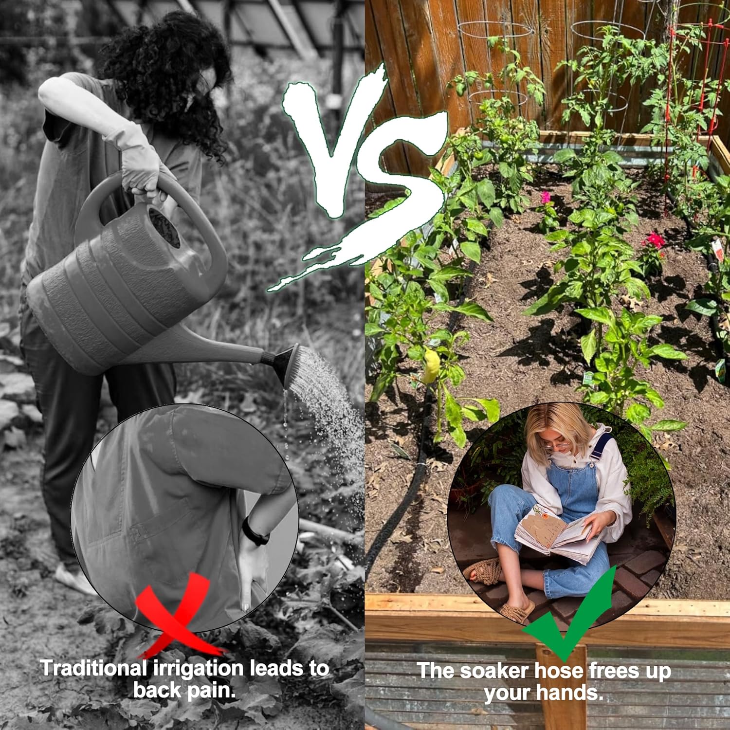 - 【Flexible Assembly and Efficient Irrigation】Soaker hose kit with fittings to allow you to cut as needed to customize a variety of systems. Easy to assemble, you just need to design the distribution of the hose, connect the fittings to the hoses, turn on the faucet and whole garden can be watered at the same time. Heavy duty rubber hose saves a lot of time over traditional irrigation, you can even go do something else. Free up your hands and back, if you have a bad back this saves.