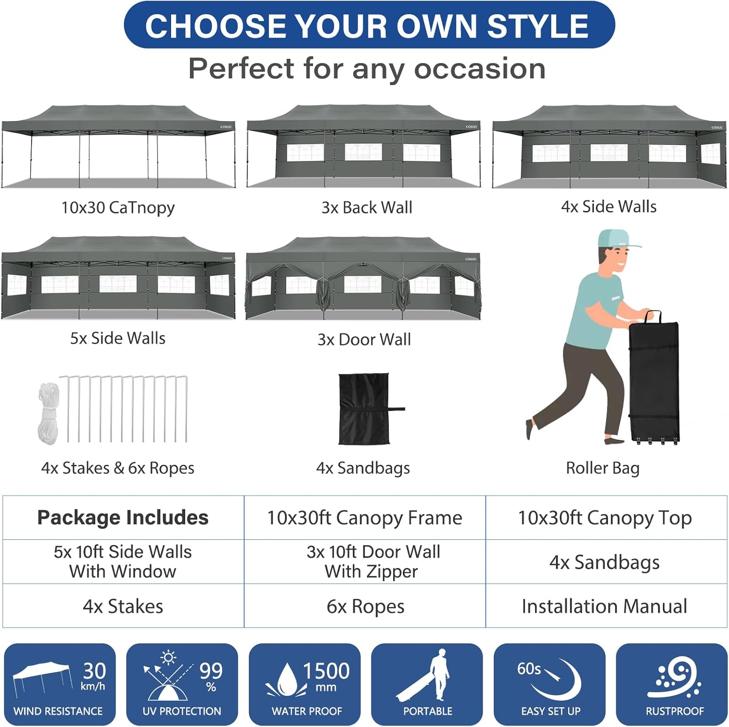 - 【WHAT'S INCLUDED】1x Commercial grade 10x30 Pop up Tent Frame, 1x 10'x30' Canopy Top Cover, 8x PU Coated Panels (5x Sidewalls with Window and 3x Sidewalls with Zipper), 4x 420D Oxford cloth PVC coated Sandbags, 4x Ground Pegs, 6x Wind Ropes, 1x Roller bag, 1x Manual. If you have any questions and doubts, please feel free to contact us, we will give you the best help. Choosing us means choosing a comfortable life.