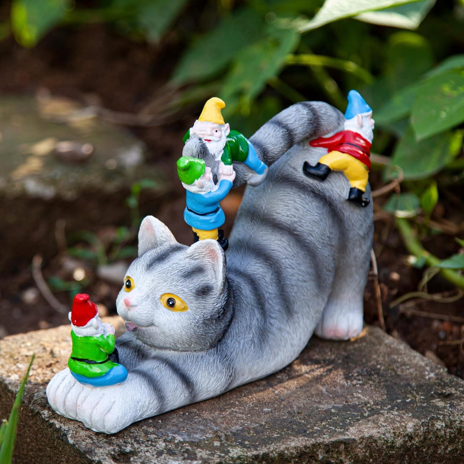 - Whimsical design】: Our garden statue showcases four cheerful gnomes joyfully playing on a stretching kitty. Whether placed in your garden or indoor and outdoor spaces, it adds a touch of charm and lively cuteness!