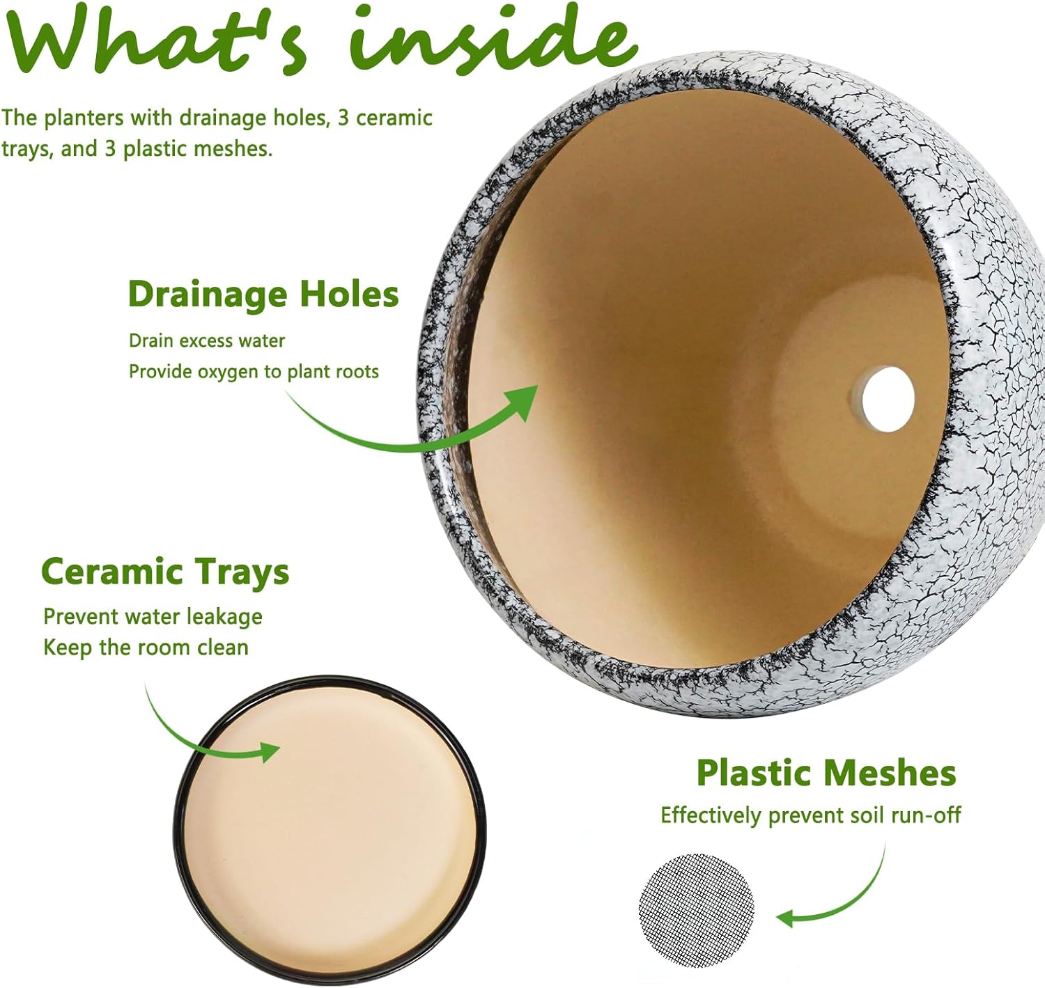 - Drainage Holes and Accessories: Each ceramic plant pot has a drainage hole at the bottom, a mesh, and a ceramic tray for collecting water. This will provide ample oxygen to the plants