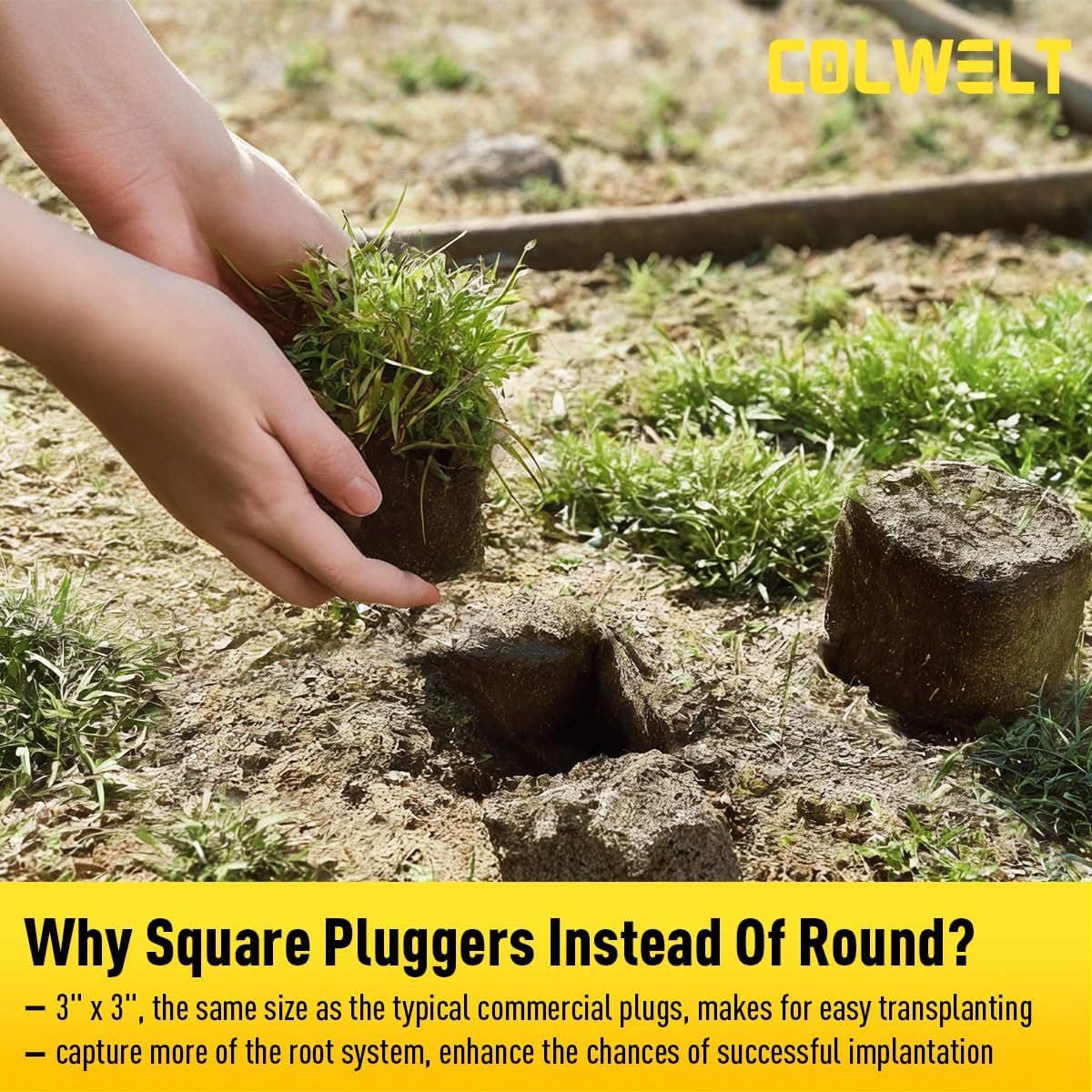 - CUTS A 3" X 3" SQUARE PLUG -- Colwelt grass plugger tool picks up a 3" X 3" square piece of sod or soil, the same size as the typical commercial plugs. What’s more, compared to round shapes, square design likely captures more of the root system, enhancing the chances of successful implantation. Assembly is quick and easy with instruction and all necessary fixings and tools. If you have any questions or need assistance, please don't hesitate to contact us. We are always here to help.