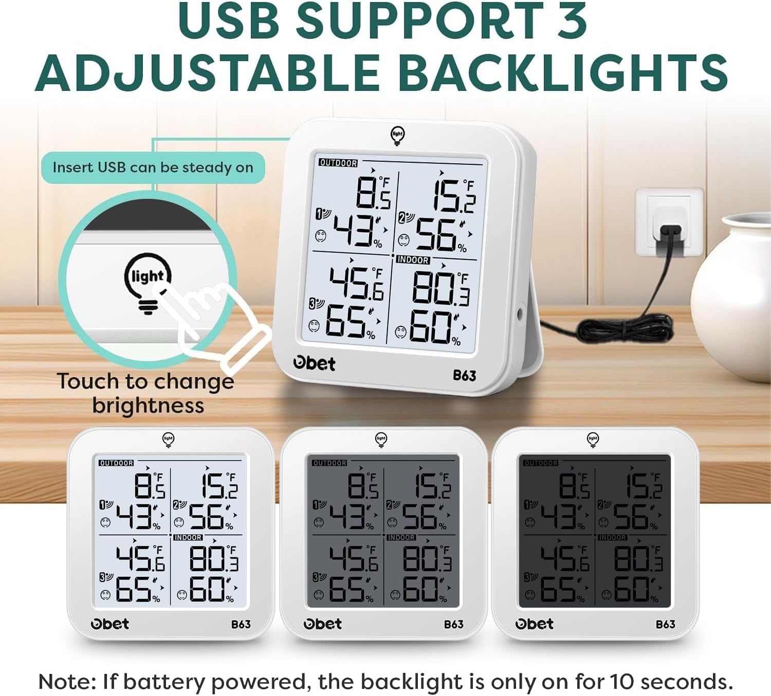 - What You Get: 1 thermometer, 3 sensors, 1 USB cable, instruction. For better experience, OBET provides 30 days of return and exchange on Amazon, also one-year warranty service.