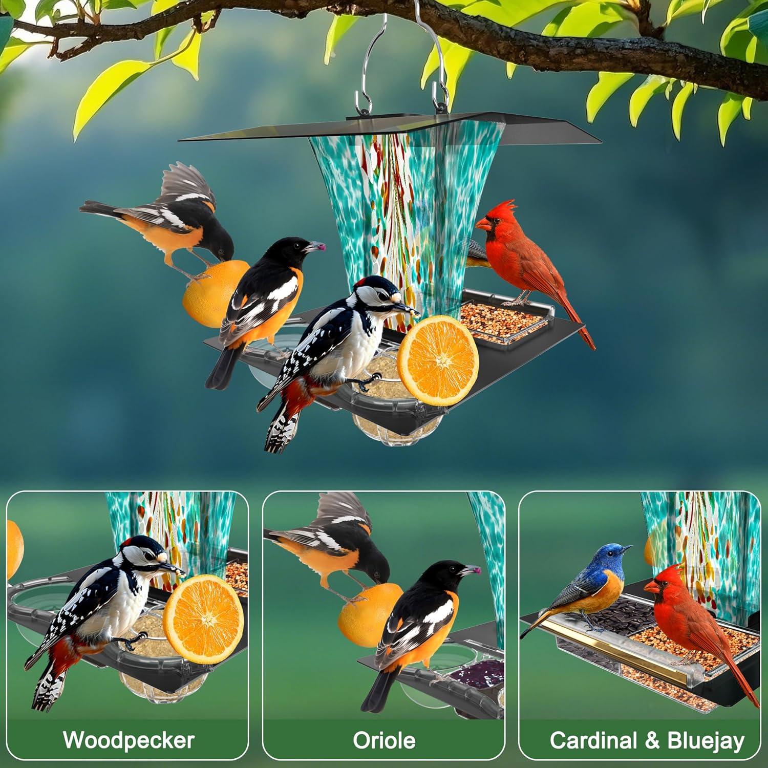 LUJII 6-in-1 Solar Bird Feeder with RGB String Lights, Hand Blown Glass, 2 Removable Trays for Bird Seed, Suet Ball, Mealworm, Oriole Orange Fruit, Jelly or Water, Teal