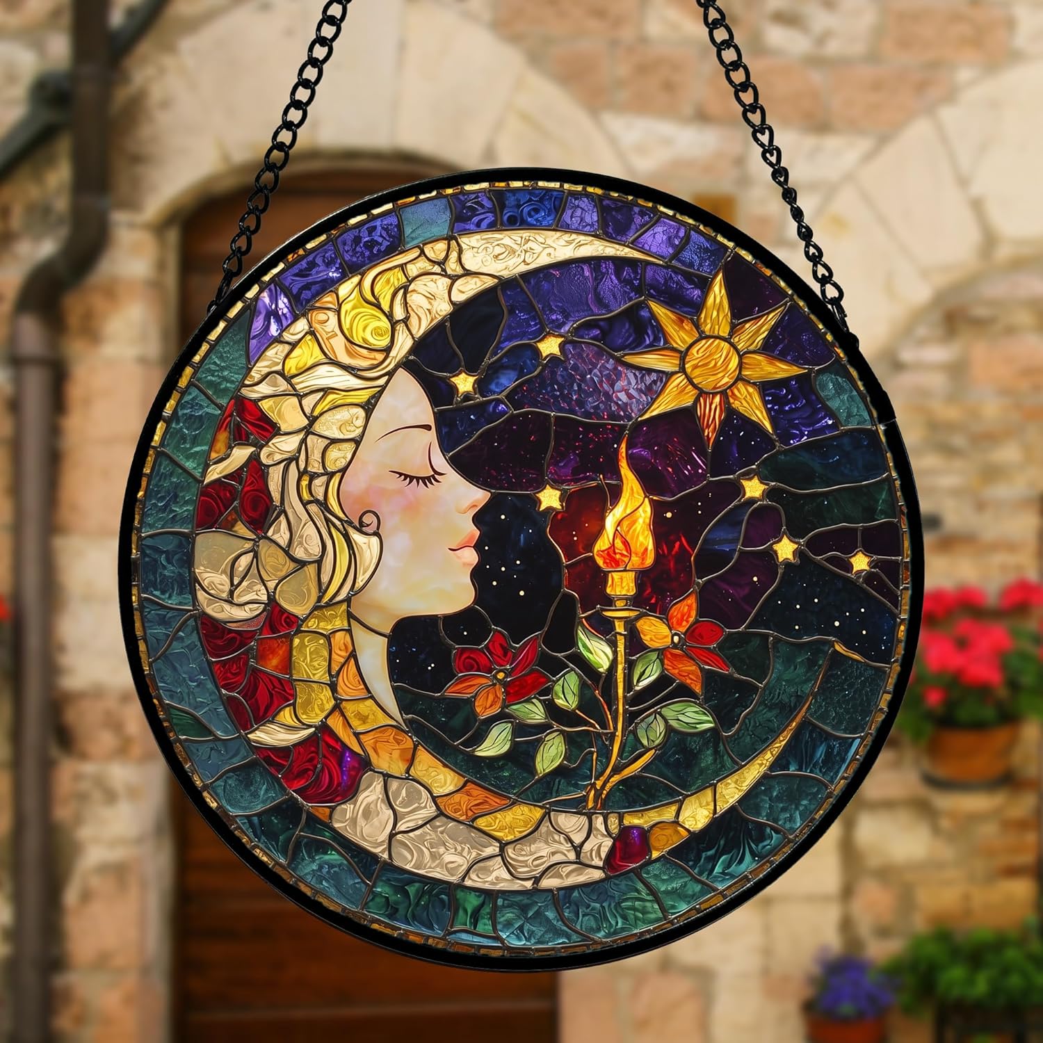- Sun Catchers Indoor Window : This stain glass window hanging captivates with its vibrant and rich tones. Stain glass window hanging has a double-sided light transmission, it come to life when illuminated by natural light, infusing your home with happiness.