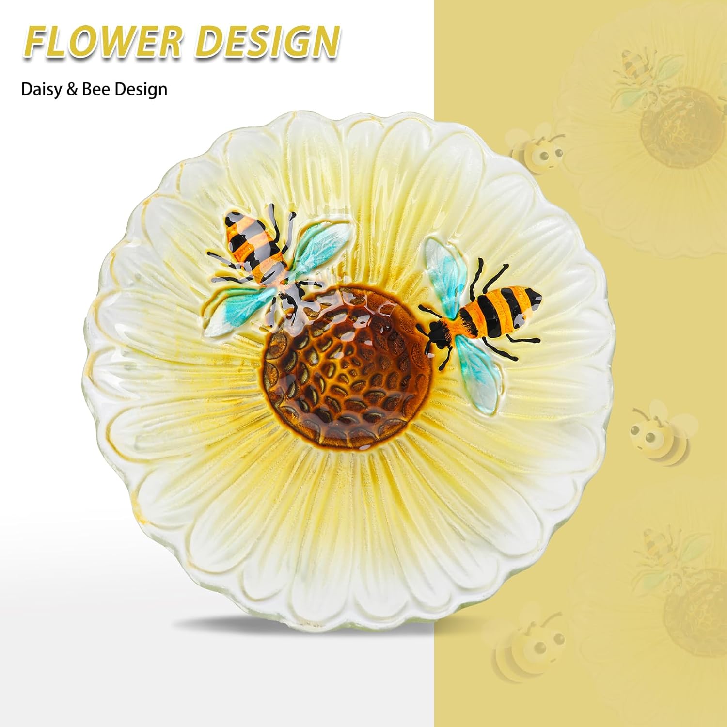 - {Yellow Bee Birdbath} Uses special substantial nontoxic glass, causes zero harm to birds and other creatures, and this glass bird baths for outdoor has yellow color bees as well as distinctively bright-colored which would attract more birds to bathe