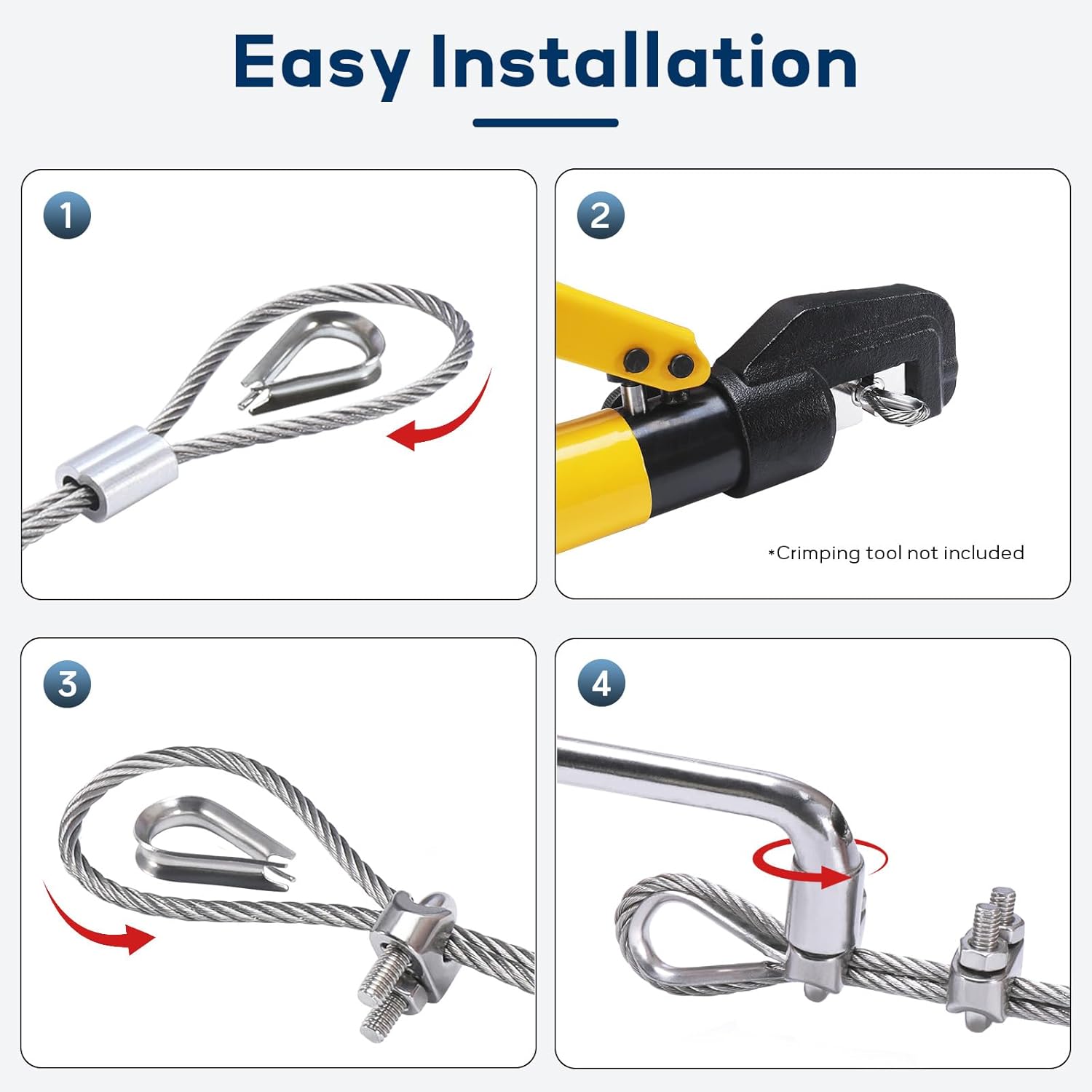 - Complete Kit for Quick Installation: Includes a sharp yellow cable cutter, 12 wire rope clips, 12 thimbles, 24 crimping sleeves, and 1 socket wrench. This kit provides all the essential tools needed for a quick and easy setup, saving you time and effort