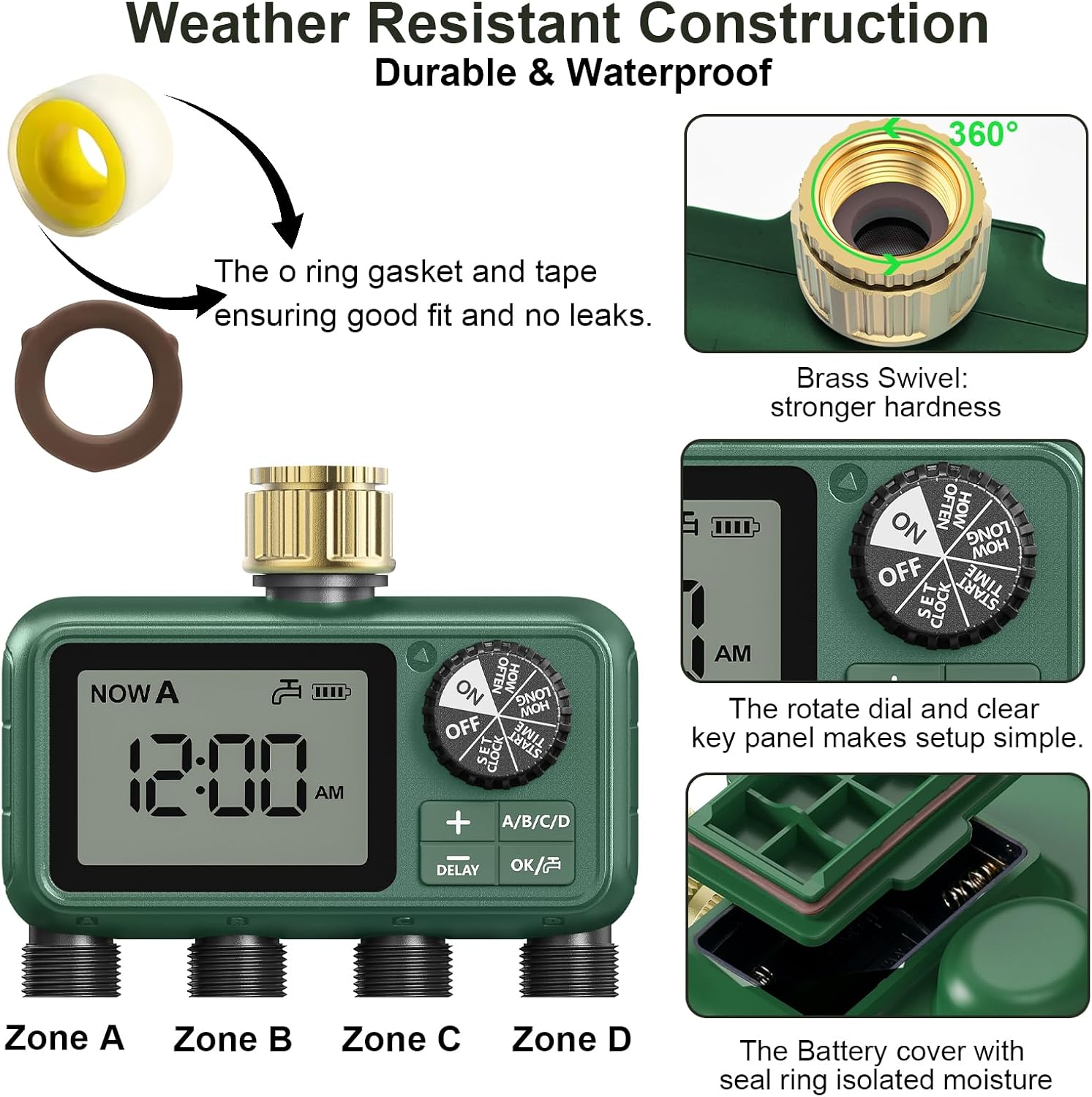- Easy Setup & Intuitive Operation: This 4-zone programmable hose splitter allows independent scheduling for four separate watering zones. The large, sunlight-readable LCD clearly displays watering time, frequency, and battery level. With a user-friendly dial and button controls (Zone A/B/C/D), you can quickly set schedules without tools. It installs easily on a 3/4" faucet and is designed for hassle-free operation.