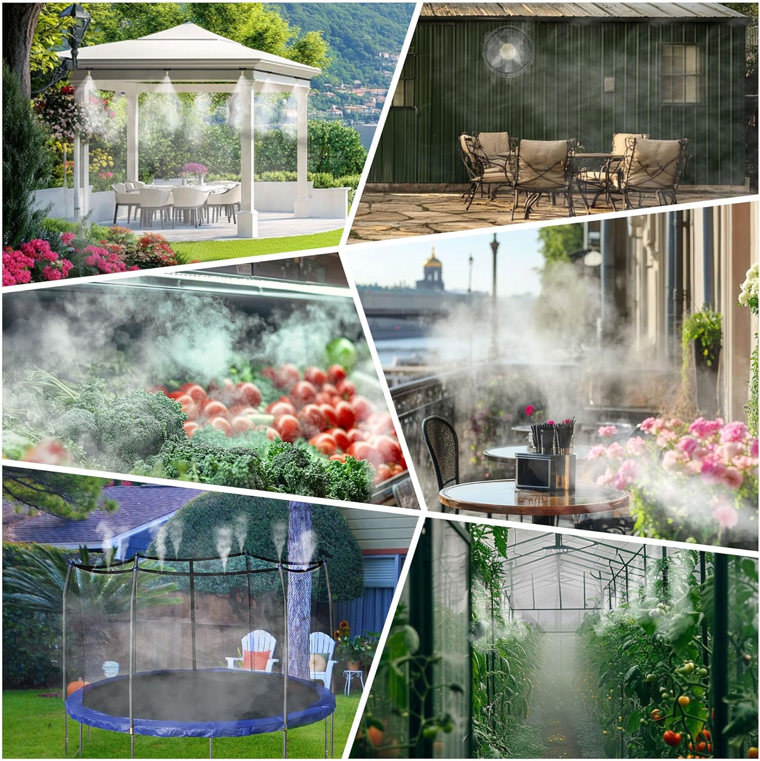 - 【Wide Application】: 1. For garden, landscaping, greenhouse, humidification. 2. For cooling people, birds and animals in heat or dry days. 3. Mist cooling system. 4. For keeping fruit fresh and prevent moisture loss. 5. For swimming pool misting fog cooling.