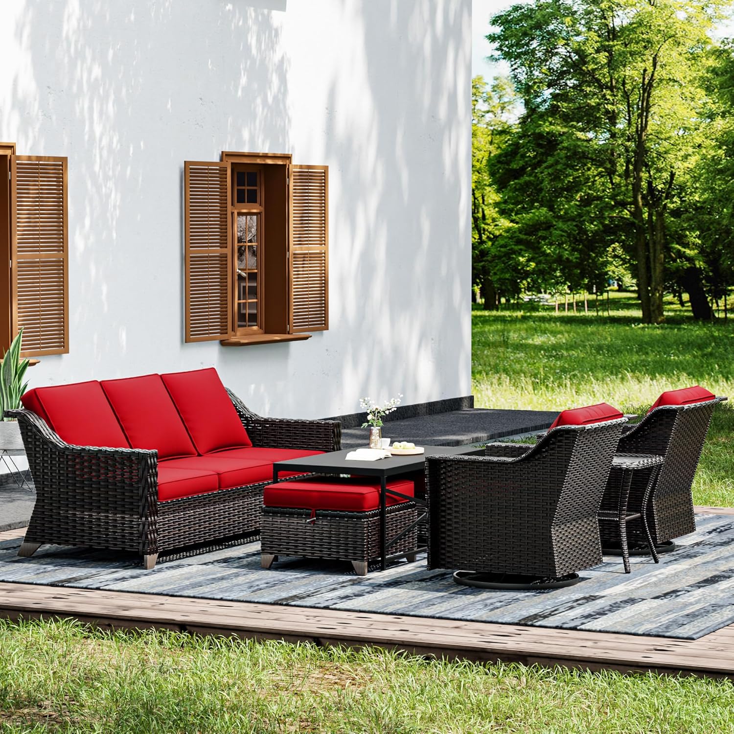 Joyside Wicker Patio Furniture Sets, 7 Pieces Upgraded Large Size Outdoor Furniture with Swivel Rocking Patio Chairs, 3-Seat Sofa, Outdoor Ottoman and Coffee Table, Thick Cushions, Wide Armrest
