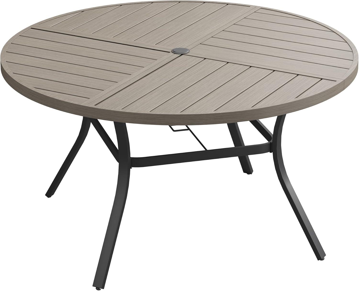 DIFY 53.1" Round Outdoor Patio Dining Table for 6-8, All-Weather Metal Steel Slatted Patio Table with 1.57" Adjustable Umbrella Hole, for Lawn Garden Porch Backyard, Grey Wood-Like