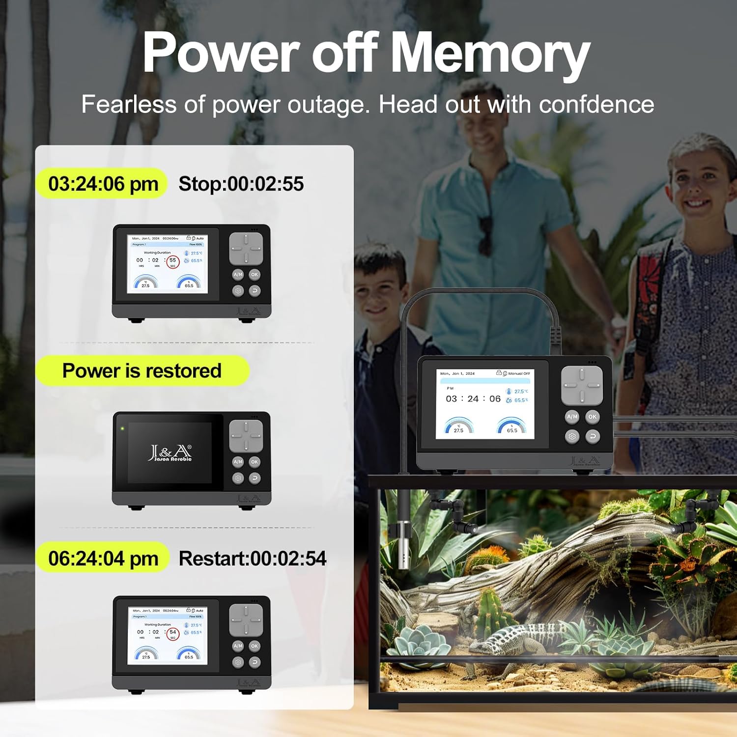 - Power-Off Memory: The power-off memory function ensures that the auto-misting system for reptiles resumes operation immediately upon power restoration, eliminating the need to reconfigure misting settings. This feature guarantees uninterrupted program control, maintaining optimal environmental conditions to support the health and well-being of your terrarium inhabitants