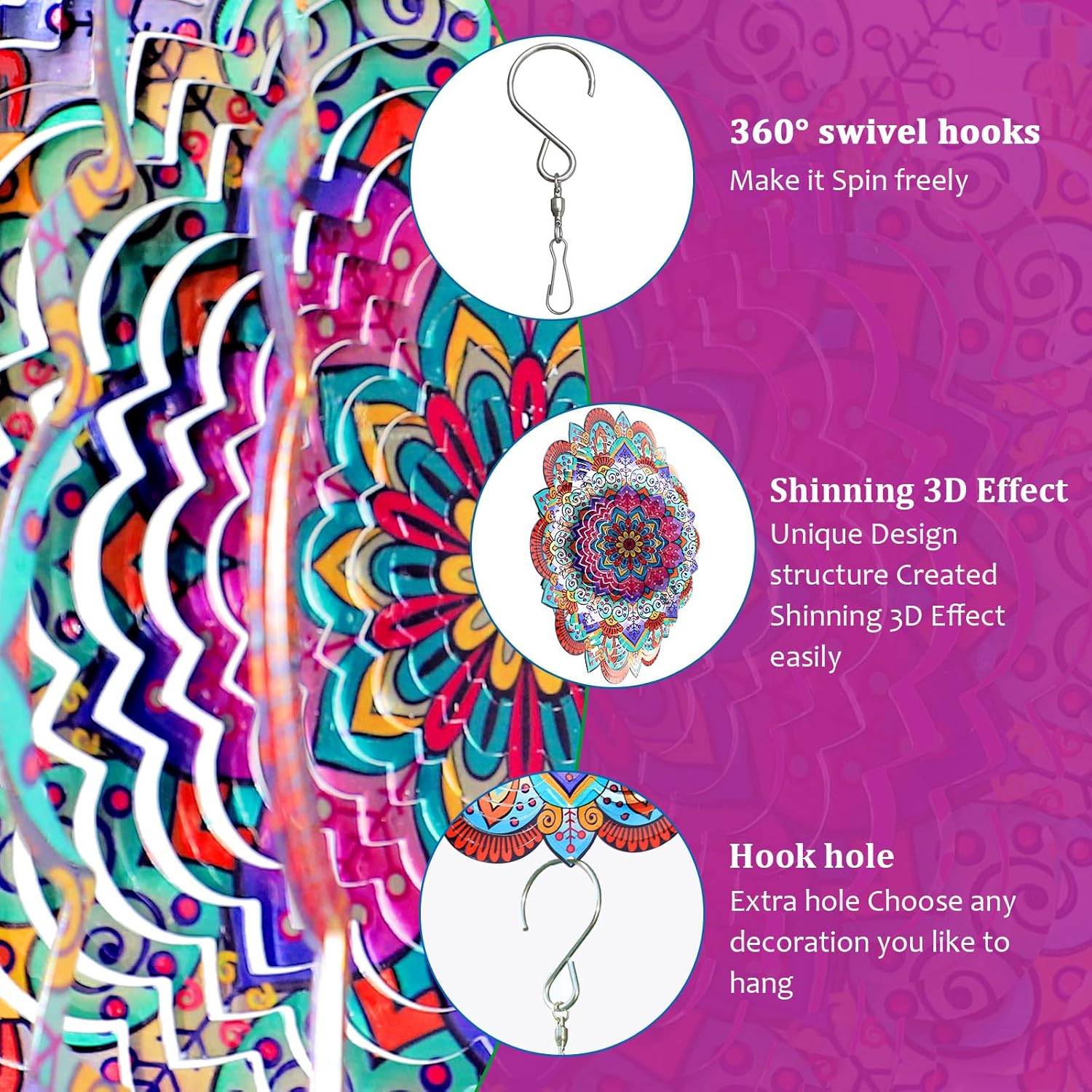 - 【3D Mandala Wind Spinners】The mandala wind spinner showcases a breathtaking 3D mandala design. As it catches the sunlight, it imparts vivid colors and lively movement, creating a captivating display that offers both a delightful visual experience and a sense of wonder. This mandala spinner is sure to enhance the charm of your home and garden.