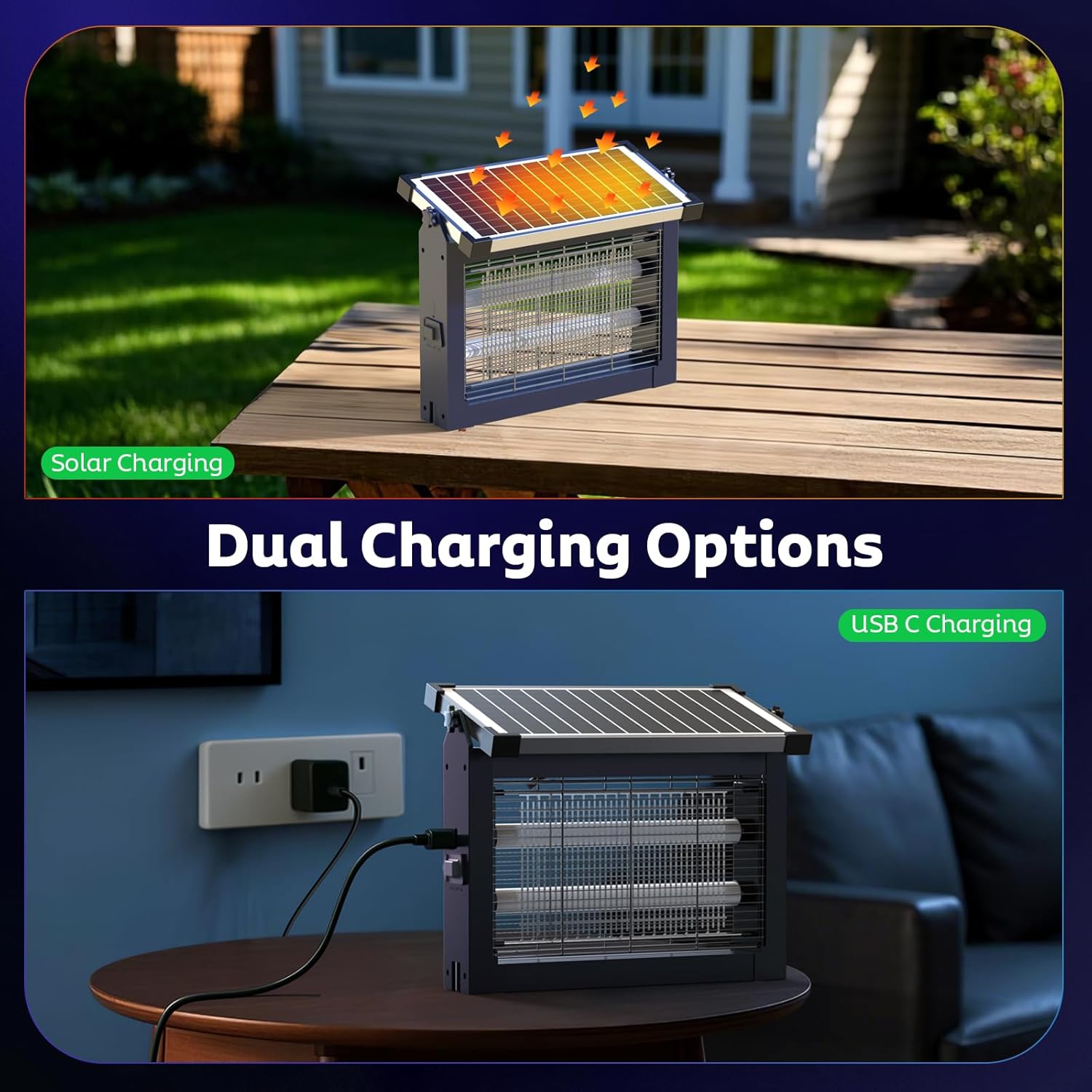 - Dual Charging Options: Solar & USB Powered: This solar powered mosquito zapper features a 10W 5V monocrystalline solar panel and a 4,000mAh rechargeable battery for eco-friendly, energy-efficient operation. Charge it with direct sunlight for sustainable use, or quickly recharge via USB using the included 4ft USB-C cable in just 3-4 hours. Enjoy up to 12 hours of continuous protection on a full charge. Ideal for both indoor and outdoor use, whether at home, in an RV, camping, or in your backyard