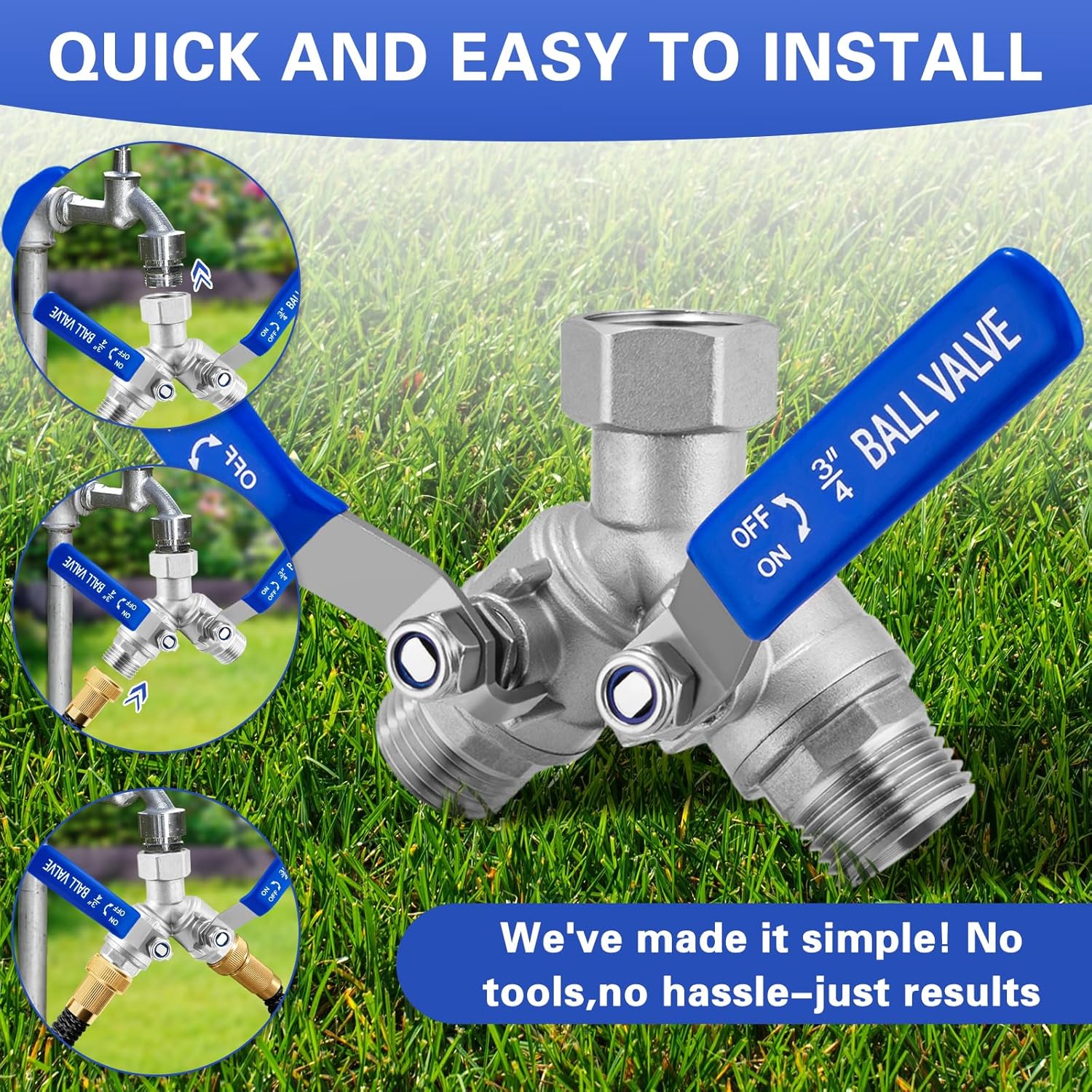 - 【Easy Installation】The hose y splitter with shutoff is threaded and securely connected, requiring no tools and easy to install. Hose splitter 2 way has a large rotary nut that can be turned 360°, and the hose dispenser can be quickly attached to any standard outdoor faucet.