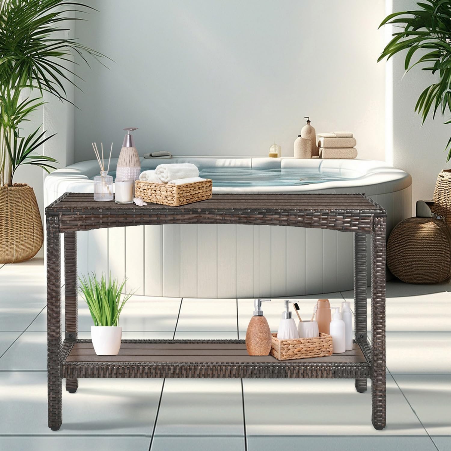 - ăUnique & Modern DesignăOutdoor console table outline with full weaving of durable,high-quality PE rattan,espresso brown resin wicker weave brings an elegant and classic style to your home or patio, 2-tier design providing ample storage space,upper poly lumber top provides a spacious and solid countertop to display napkins, plates, utensils and fruits,easy-cleaning lower shelf provides additional storage for your essentials, potted plants and potting accessories