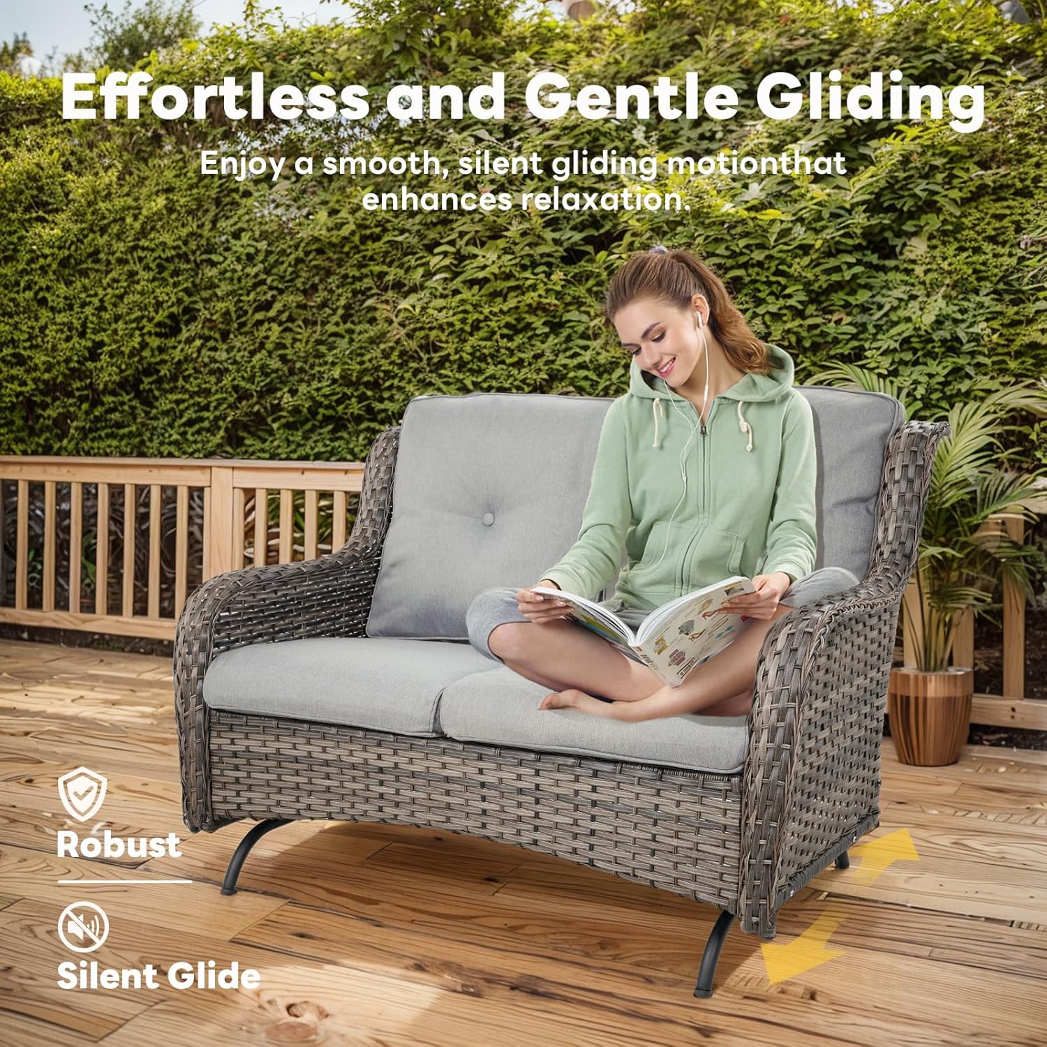 - 【Durable All-Weather Wicker】: Crafted with handwoven PE wicker and a rust-resistant steel frame, this patio furniture set is built to withstand various weather conditions. Each outdoor swivel rocker chair supports up to 350 lbs, and the loveseat glider holds up to 500 lbs, ottoman up to 250 lbs offering strength and stability for long-term use.