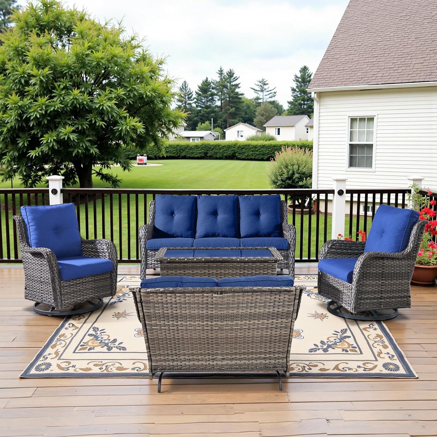 - 5-Piece Outdoor Patio Furniture Set – This patio furniture set includes a loveseat glider, two swivel rocker chairs, a sofa, and a multifunctional coffee table with storage for the Belord ottoman. Perfect for patios, porches, and backyards, it combines relaxation and style for any outdoor setting.