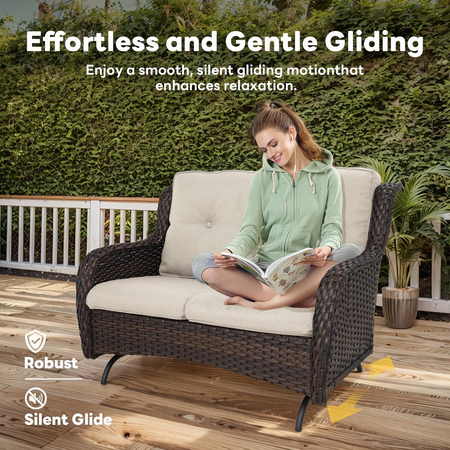 - Comfortable Swivel Rocker Chairs & Loveseat Glider: Enjoy the smooth glider and 360° swivel features of the two rocker chairs, perfect for relaxing and unwinding. The loveseat offers a gentle gliding motion, ensuring a cozy outdoor experience for two. It is ergonomically designed with wide armrests and thick 4-inch cushions for maximum comfort.