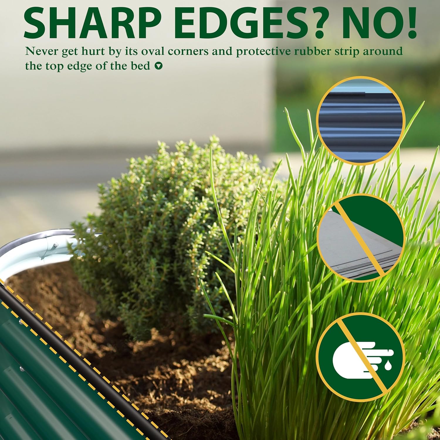 - SAFETY EDGE DESIGN- This oval shape planter box eliminates sharp corners, and the protective rubber strip around the top edge of the bed also protect you from getting hurt. Enjoy your planting time without worrying about scratching your hands!