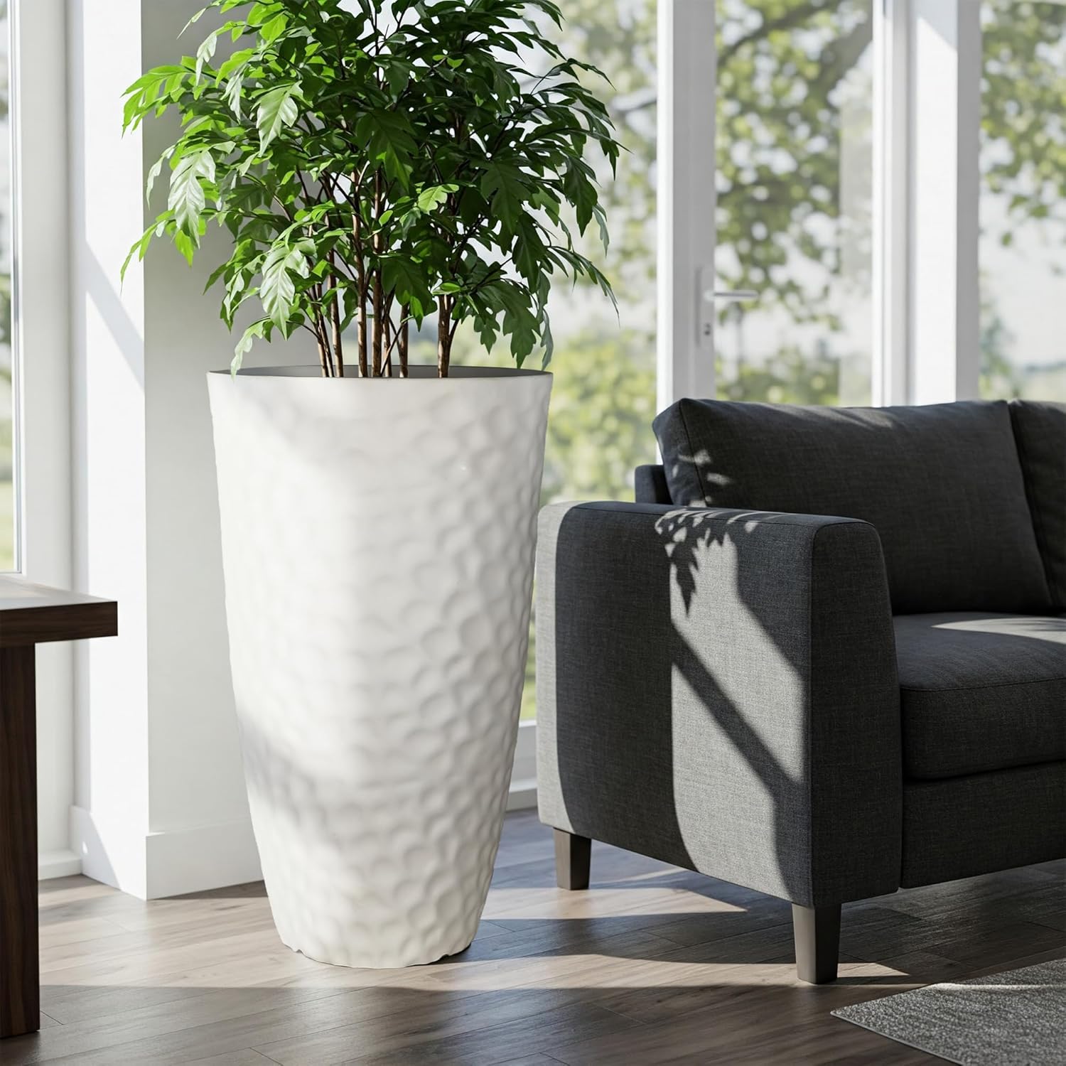 Worth Garden 24" H Tall Hammered Texture Planters Set of 2 - Matte White Plastic Flower Pot with Drainage Holes, Modern Outdoor Indoor Lightweight Pots for Large Plants, Durable Decor Containers
