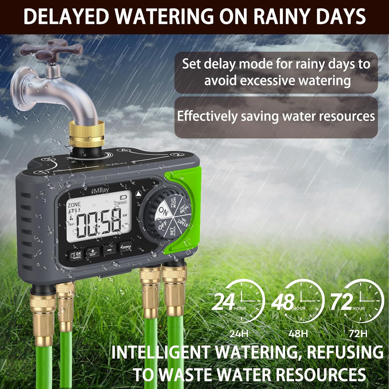 4 Zone Water Timer, Digital Water Timers for Garden Hose, Automatic Sprinkler Timer for Garden Hose, with Rain Delay & Manual Watering, Pure Brass Inlet
