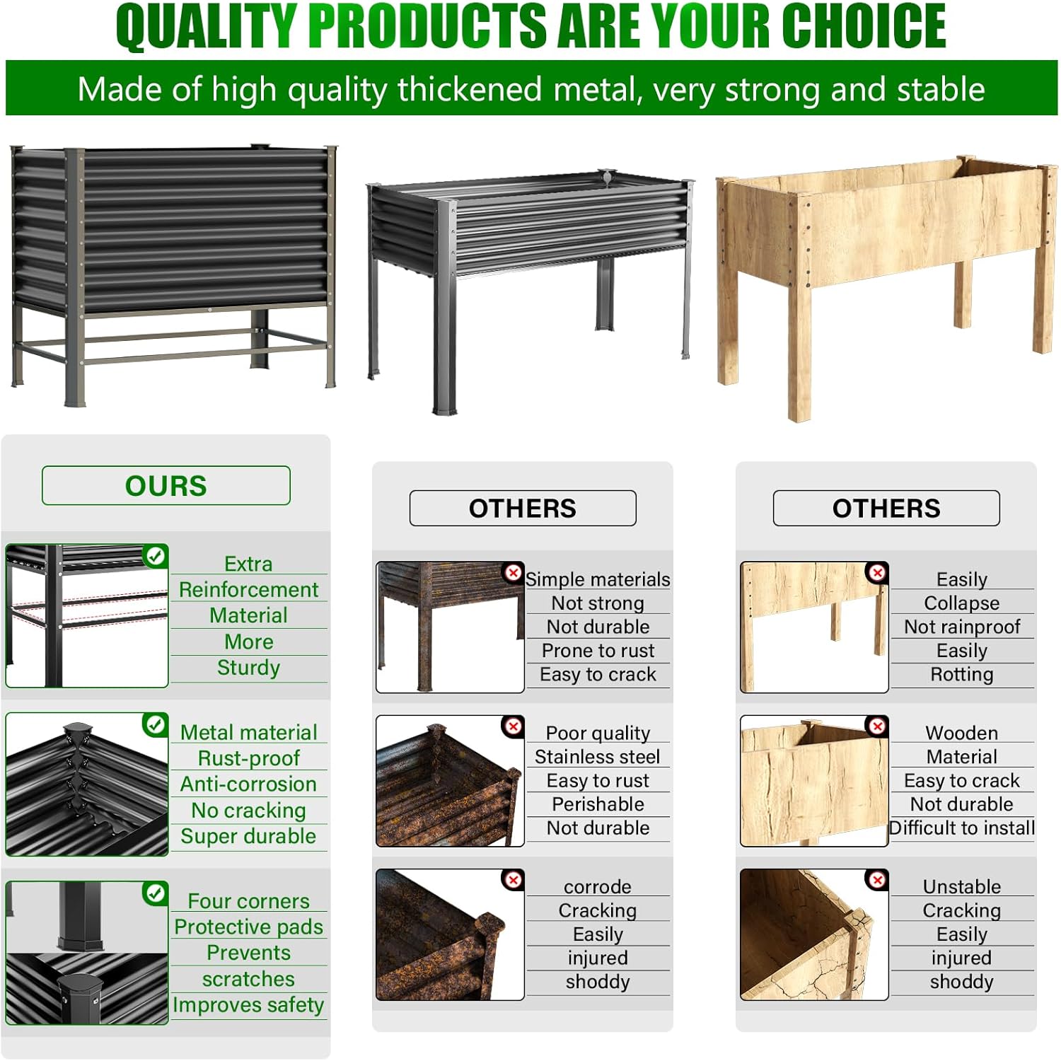 - 【Distinctive Design】-Outdoor elevated garden beds, our custom design style features galvanized sheet metal on the top, a stainless steel frame on the middle base, and the lower four corners are made of heavy-duty steel with a black powder-coated finish,This combination exceeds the lifespan of wooden products and ensures excellent rust resistance to keep the garden bed in the best condition for a long time.