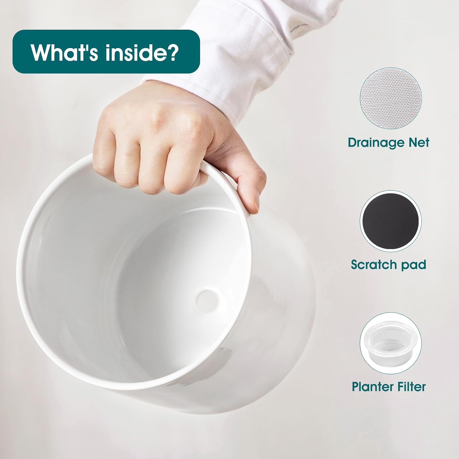 - 【Smart Drainage System】 Central bottom drainage hole + 3 essential accessories for hassle-free care: Mesh Filter prevents soil leakage and keeps surfaces clean. Anti-Scratch Pads protect tables and floors from scratches. Silicone Drain Plug lets you control water flow—no messy spills! Switch between drainage and water storage modes with ease.
