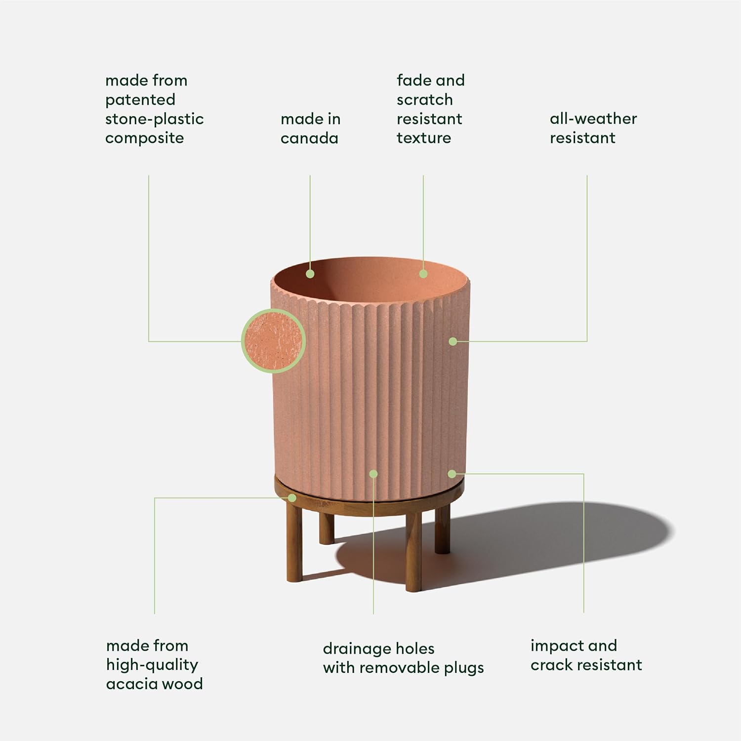 Veradek Demi Series Round Planter w/Stand for Porch/Patio | Durable Plastic-Stone Composite & Wooden Stand | Modern Décor for Tall Plants, Flowers