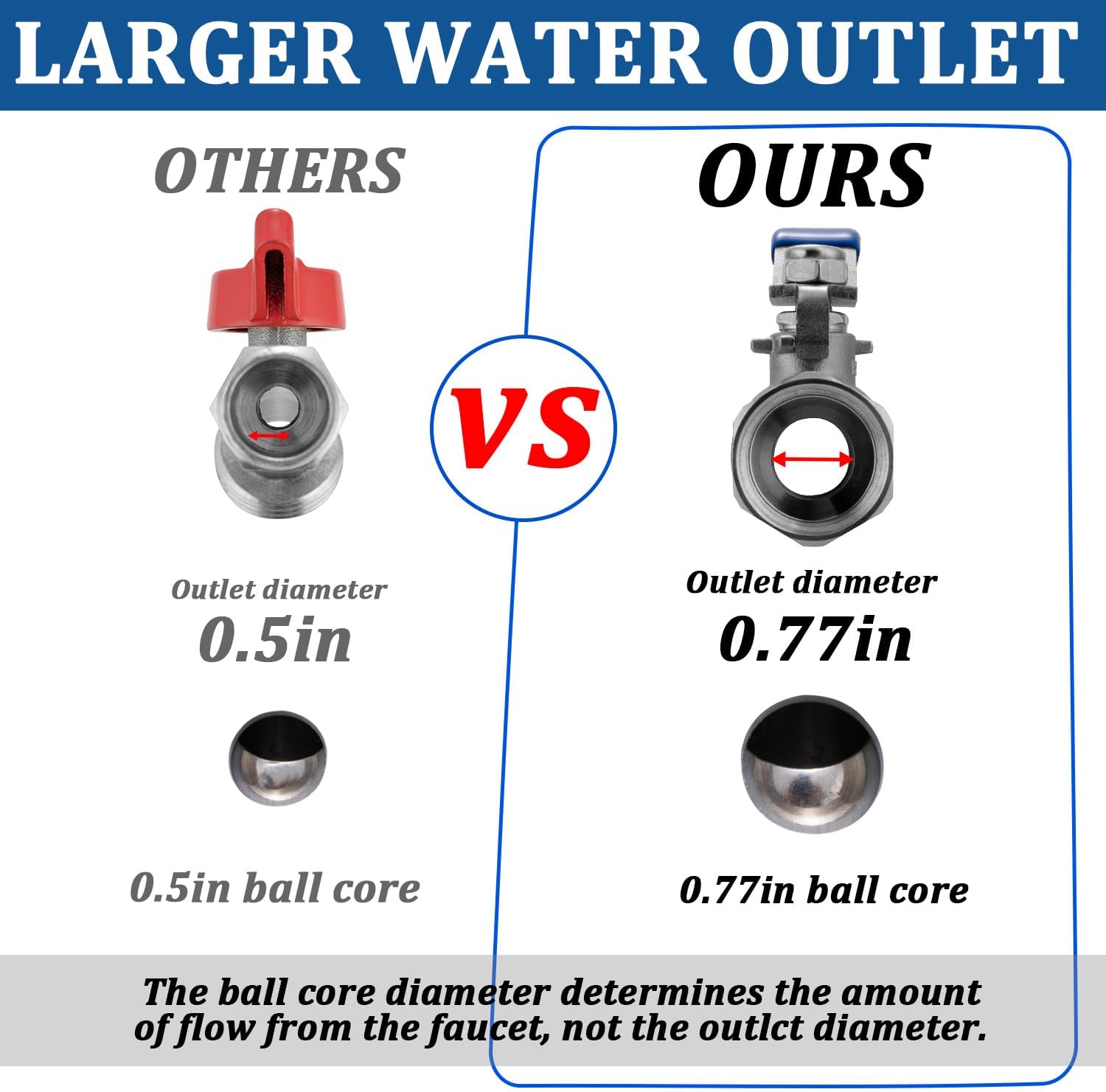 - [Full bore design]: The stainless steel rain barrel spigot adopts a full bore design, which can increase water flow and ensure smooth passage of water through the ball valve. Compared to other valves, our rain barrel spigot has increased flow by 50% -60%.