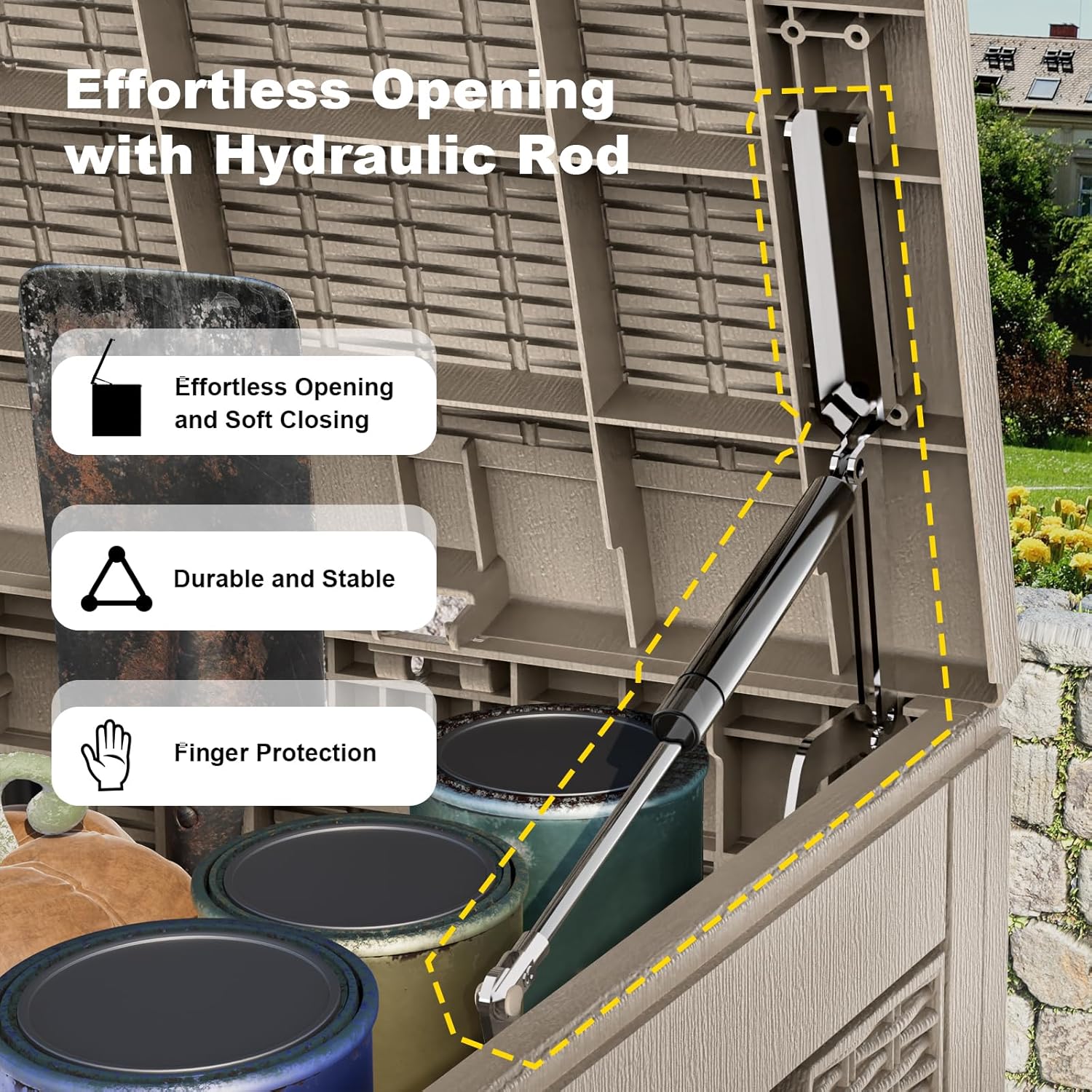 - EASY TO USE: The deck storage box is designed for convenience with built-in handles on both sides, allowing easy lifting and movement. Plus, for added security, you can install a password lock/small lock (not included) on the top cover