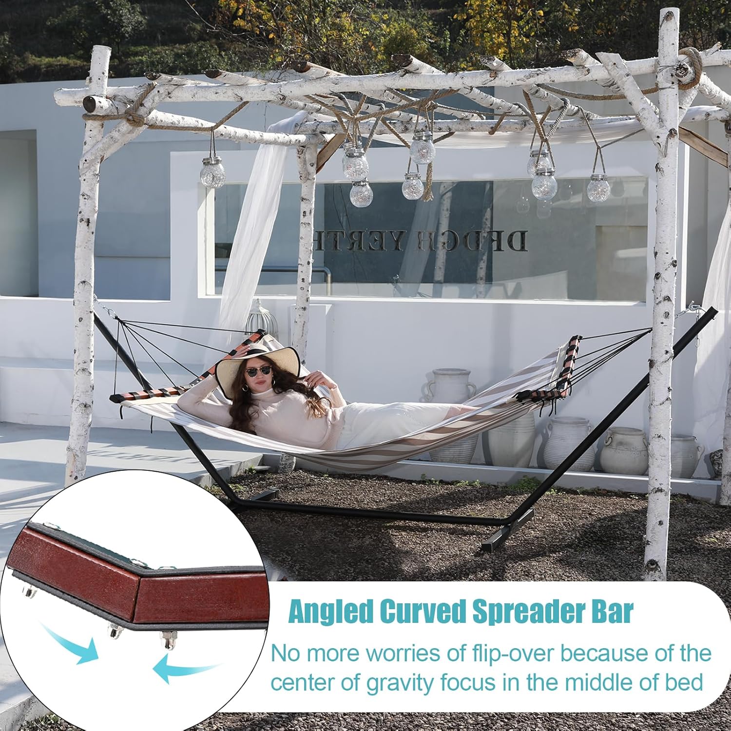 TegerDeger 12FT 2 Person Hammock with Stand Included 55 x 79IN Large Hammock Quick Dry 450LB Capacity with V Shaped Hardwood Spreader Bar & Nylon Rope for Outside, Patio, Garden - Tender Beige Stripes