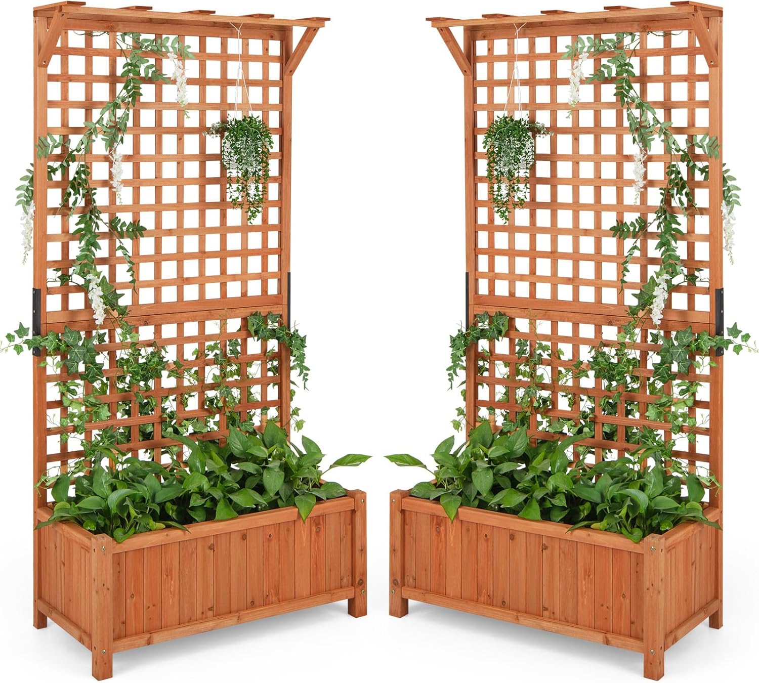HAPPYGRILL Raised Garden Bed with Trellis, 72.5" Planter Raised Bed with Drainage Holes, Freestanding Garden Box for Vine Climbing Plants, Wooden Planter Box for Yard Balcony (2, Orange)