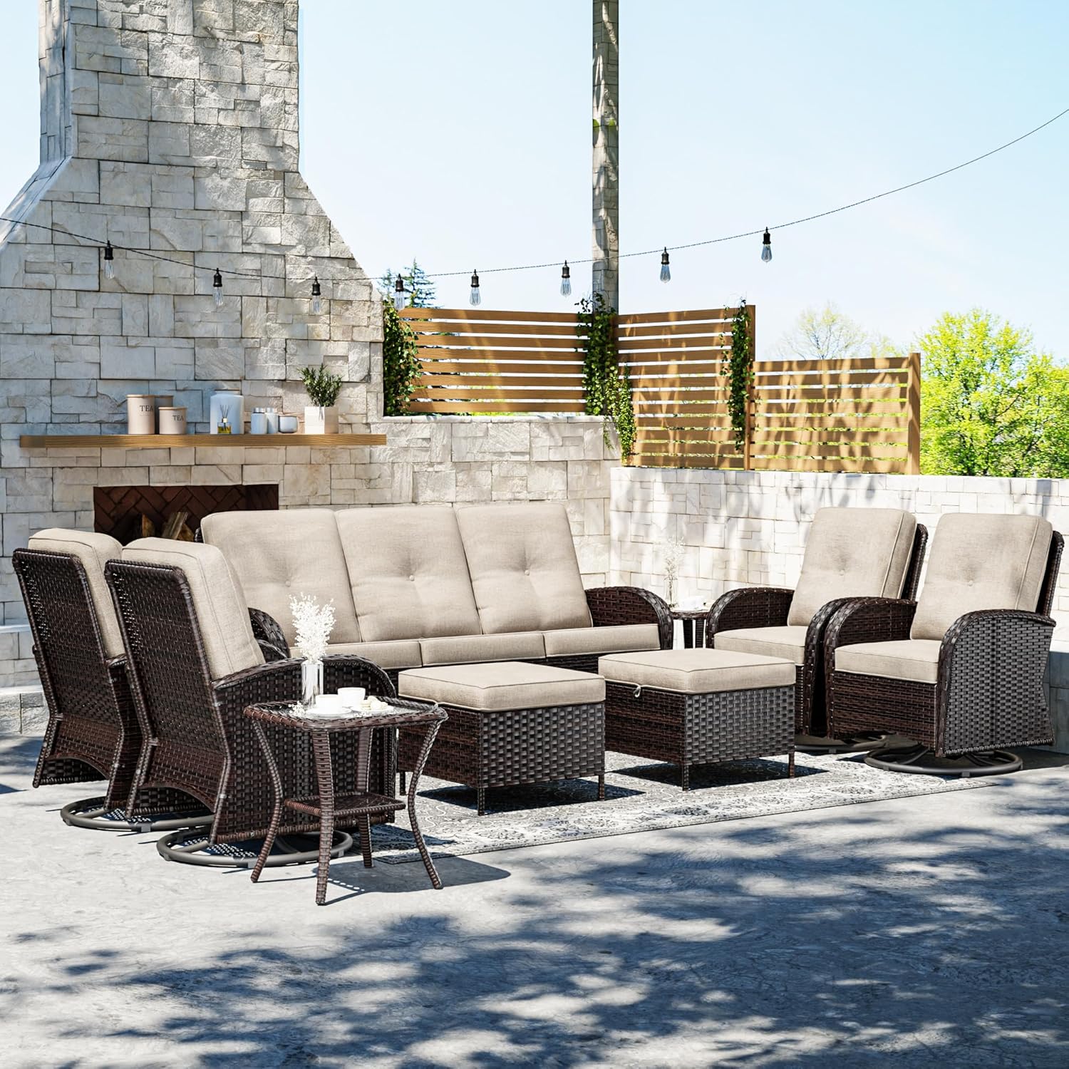 Joyside 9 Piece Patio Furniture Set, Outdoor Wicker Conversation Sets with Swivel Rocker Chairs and Sofa, Thick Cushion, Rattan Patio Sectional for Porch, Deck Use (Brown/Beige, 9 PCS)