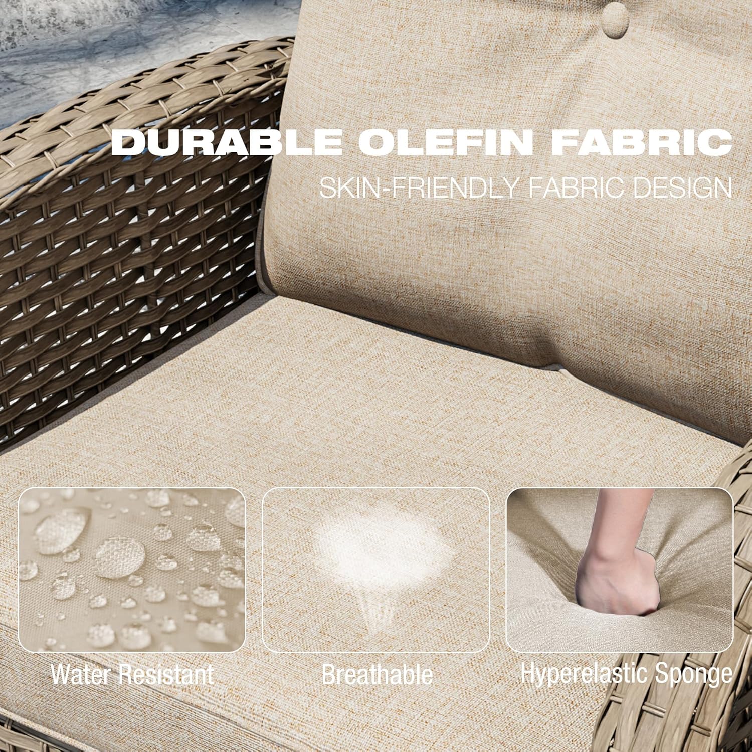 - Premium Material: The swivel chair frame is made of powder-coated steel, capable of supporting up to 300 pounds. The cushion fabric is crafted from premium OLEFIN material, which is fade-resistant and splash-proof. It ensures a sturdy and secure foundation, built to withstand the test of time and use