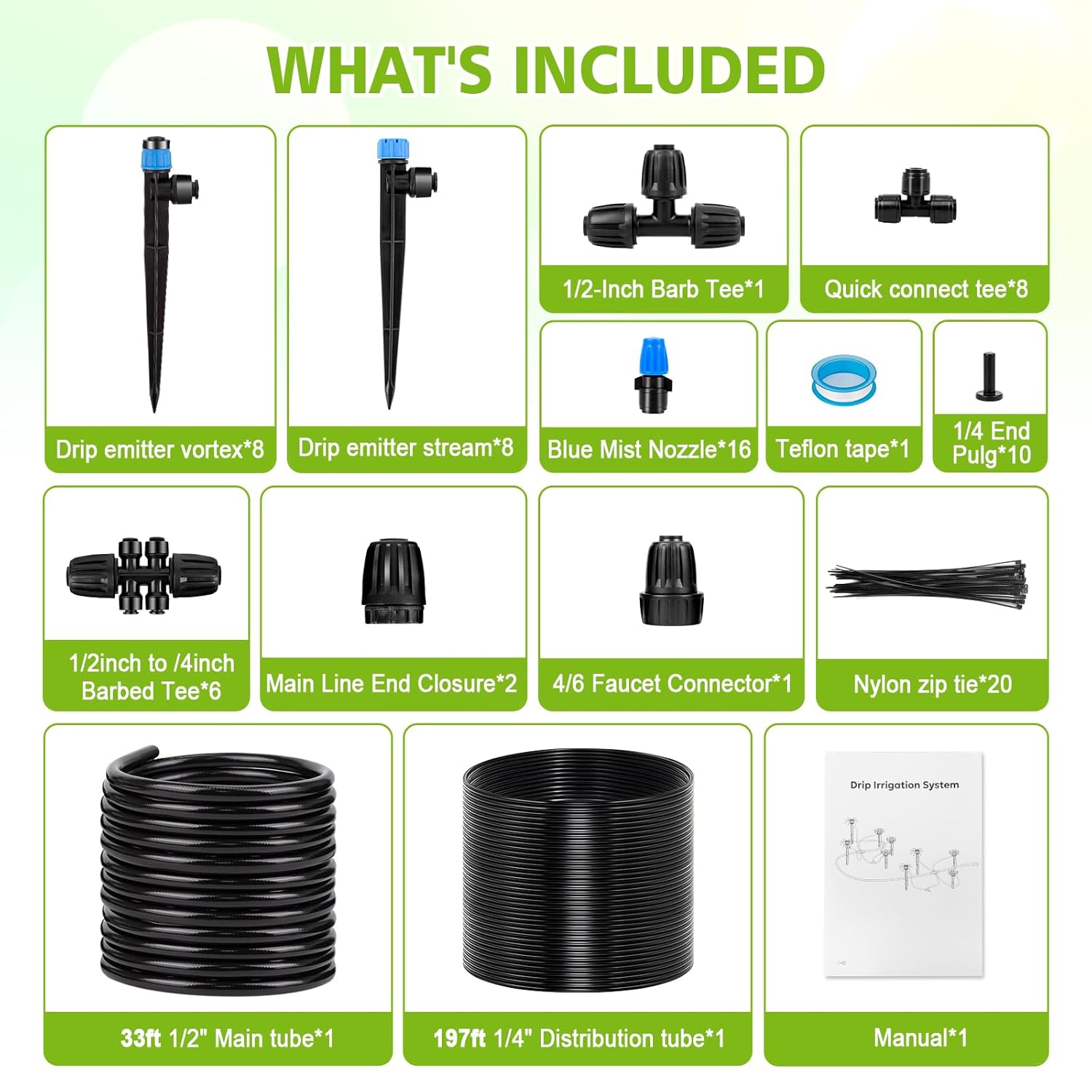 - COMPREHENSIVE DRIP IRRIGATION KIT: Kafuzi drip irrigation system comes with a variety of components to meet all the watering needs of your garden, including 197ft of 1/4'' irrigation pipe, 33ft of 1/2'' irrigation pipe, 1/2'' locking barb 6-way connector, drip sprinkler stream, vortex sprinkler, blue mist sprinkler, quick connect tee, faucet connector and other basic parts