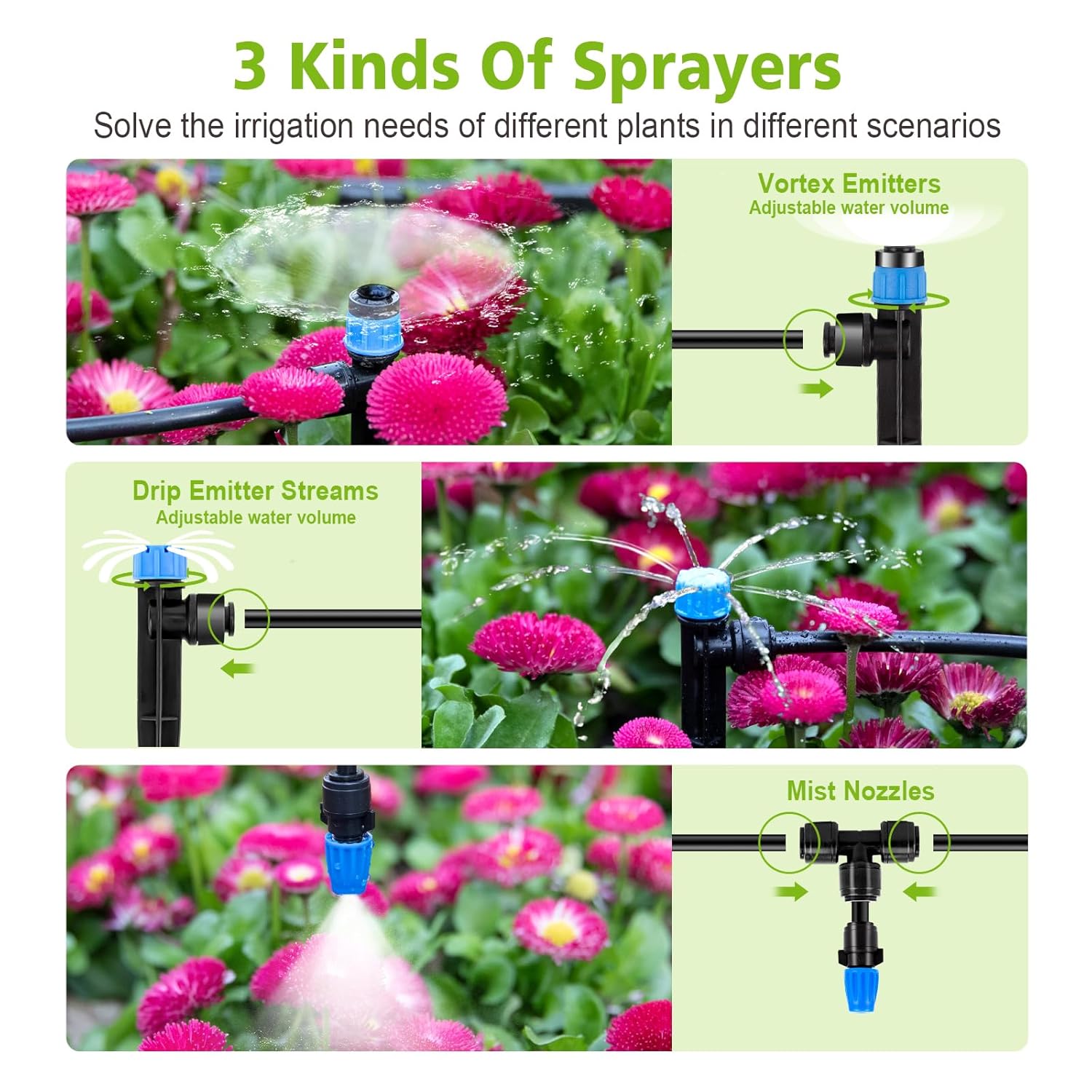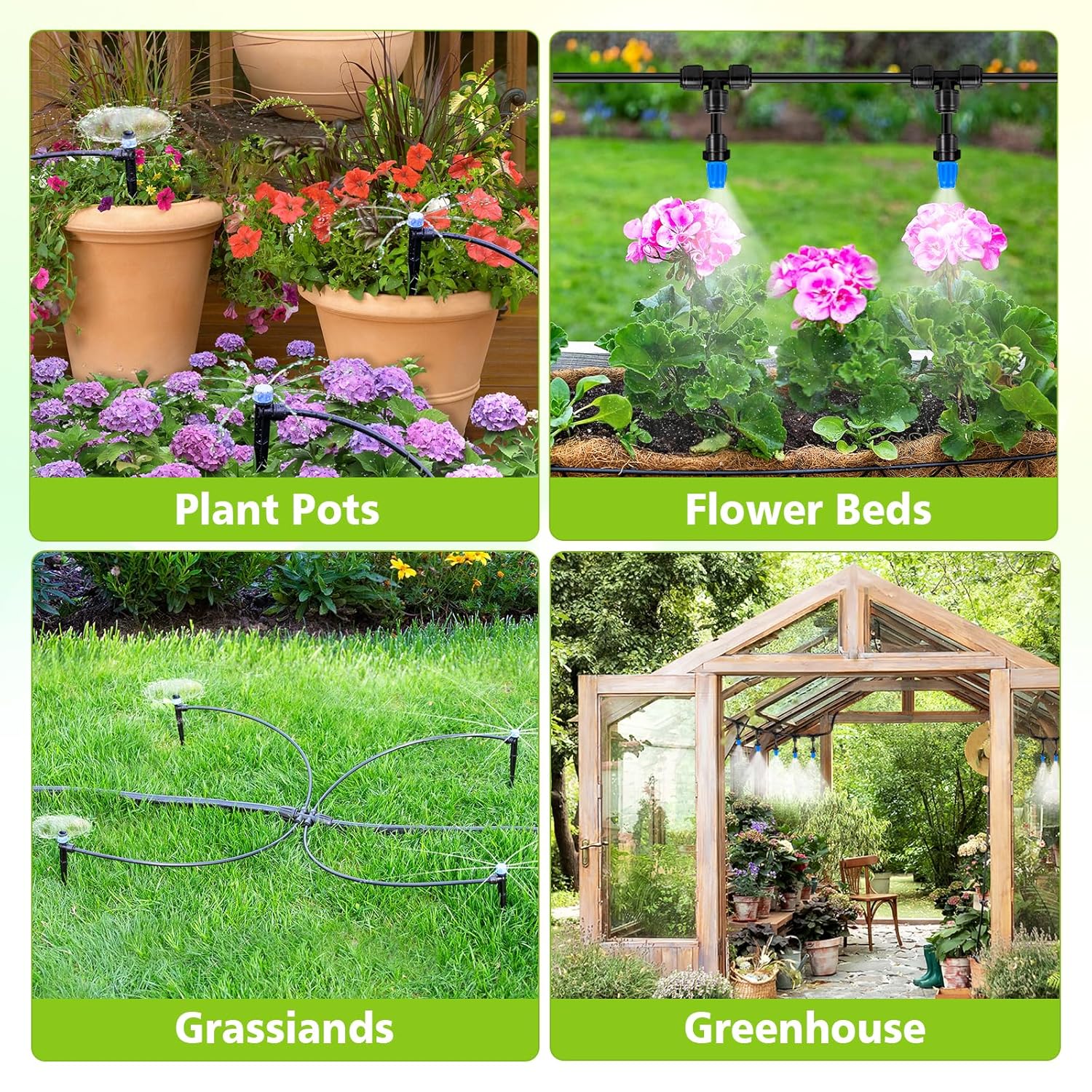 - WIDE APPLICATION: Suitable for a variety of outdoor spaces, including lawn irrigation, courtyards, gardens, vegetable plots, roof cooling, agriculture, flower beds, plant greenhouses, swimming pool spray cooling and raised beds