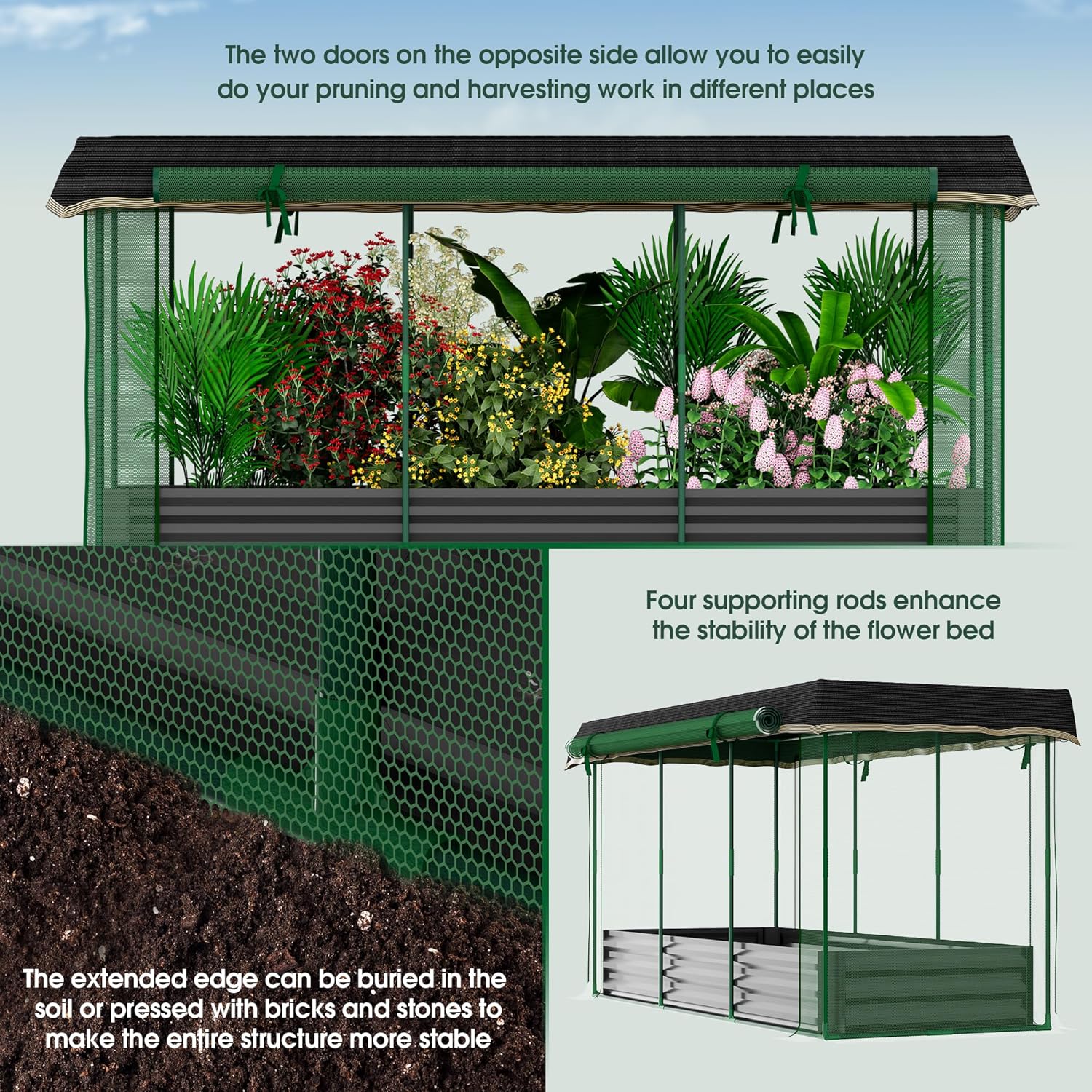 - Zipper Door Design: This plant protection netting tent equipped with two large zippered doors that can be opened and closed as needed. Two doors on this raised bed cover makes it very convenient for you to trim, harvest, and water your plants directly.