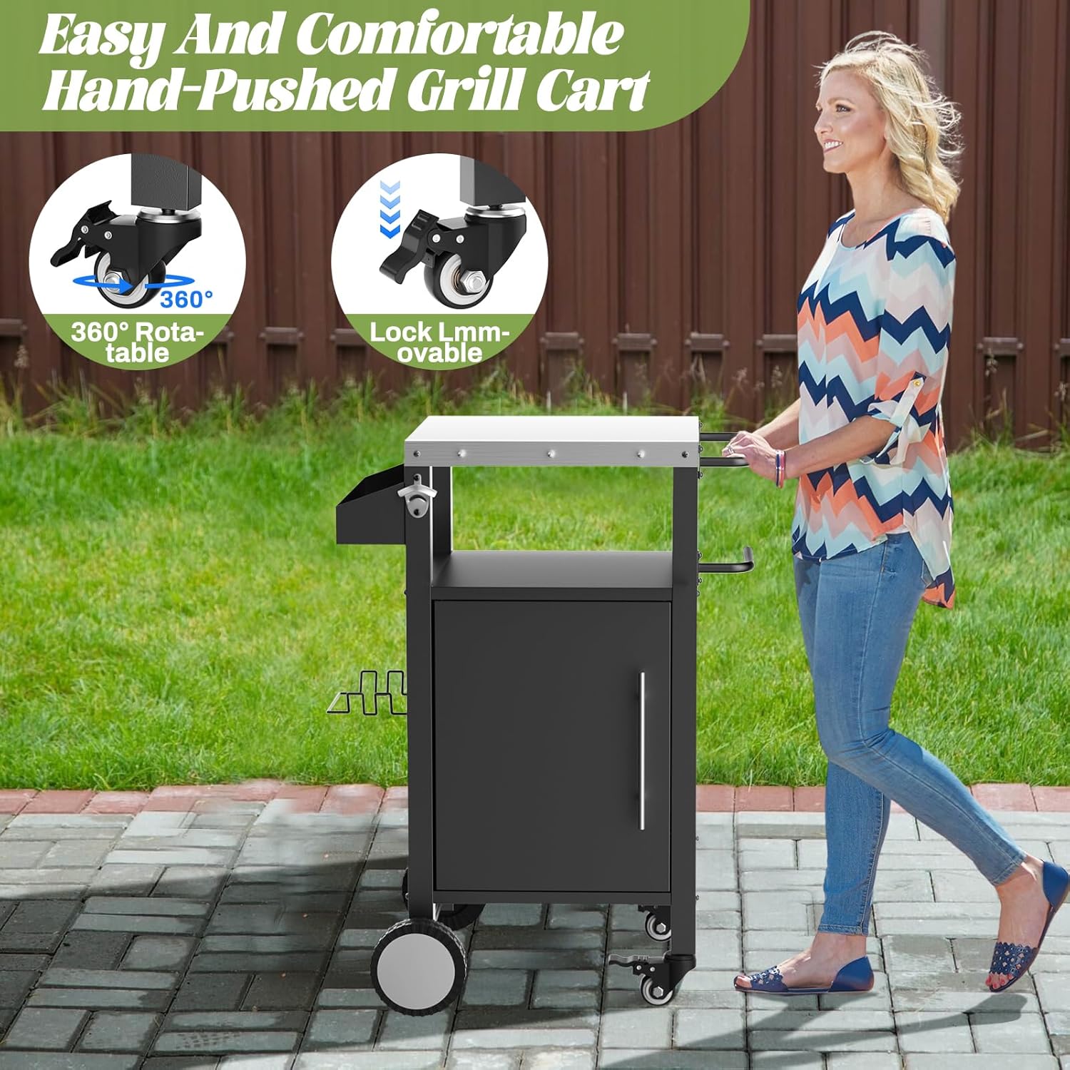 - STURDY AND DURABLE MATERIALS - Gill cart features heavy-duty square tube legs and a stainless steel tabletop, which is very stable and durable.The stainless steel tabletop provides a safe work surface that is easy to clean and maintain.The cabinet is designed with double walls and single doors on one floor-walled single door to store barbecue fuel, including propane tanks, charcoal, or wood chips. This outdoor bar cart is an outdoor entertainment necessity. Measuring 18.1"D x 18.1"W x 34.5"H