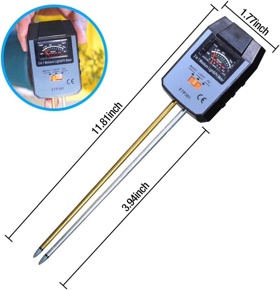 - 3-in-1 Soil Monitoring Gage: Instantly check soil moisture, light intensity,and PH levels with a single tool. All you need to do is insert the double probes into the soil, select the diagnosis you wish by sliding the switch, and then reading the info on the dial.There is a light monitor on the top of the device that reads the amount of light your plant is getting.