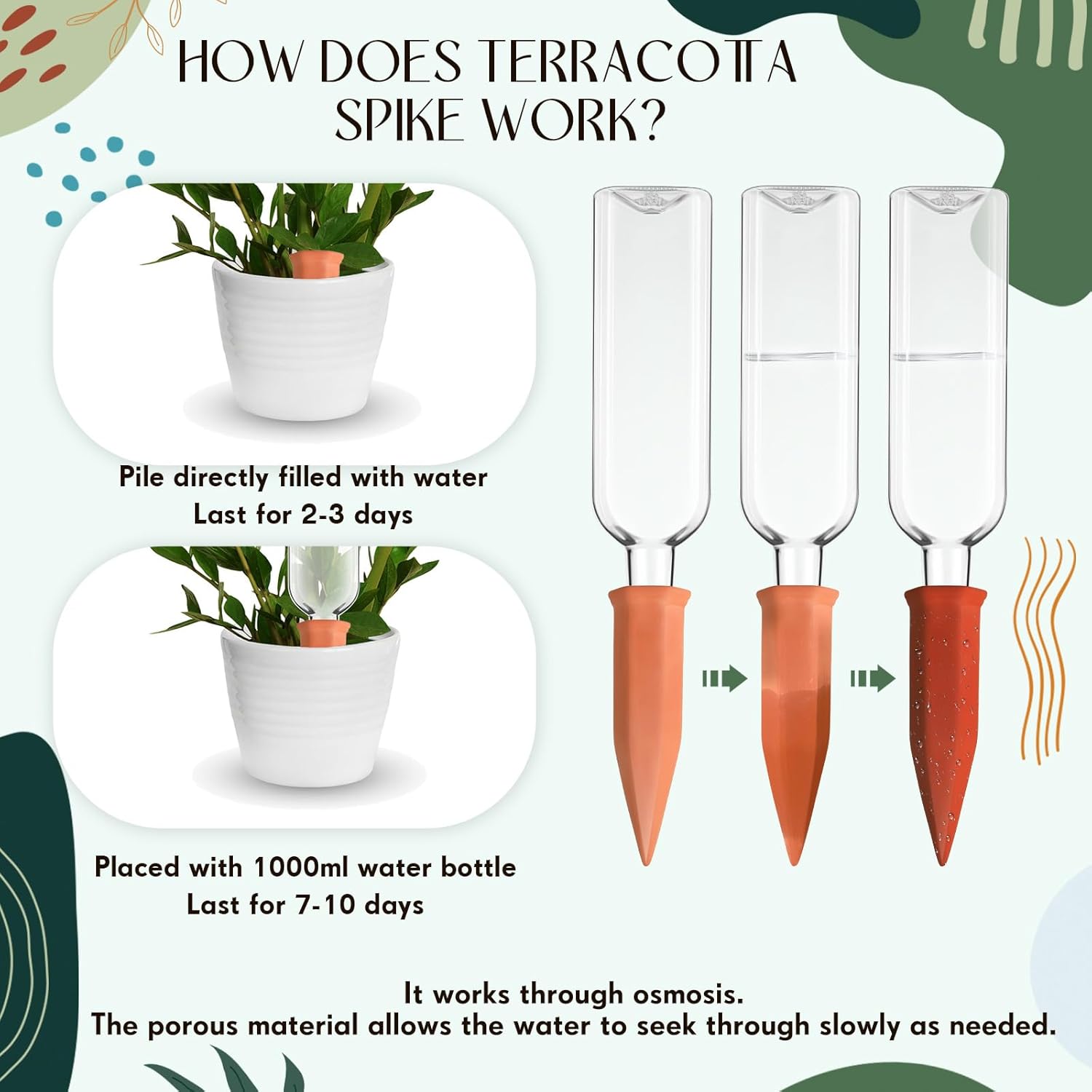 - Easy Watering: The automatic watering device ensures that the soil receives ample moisture, promoting healthy plant growth. Our terracotta watering device also features a slow-release design, guaranteeing that plants receive the right amount of water. It's very easy to use: first, water the soil, then dig a small hole and insert the watering device until the top is level with the ground. When the water in the reservoir runs out, simply remove the device, refill it, and reinsert it