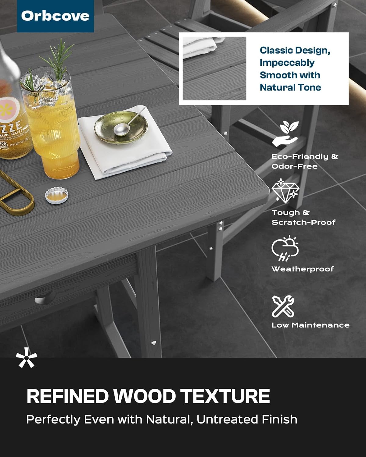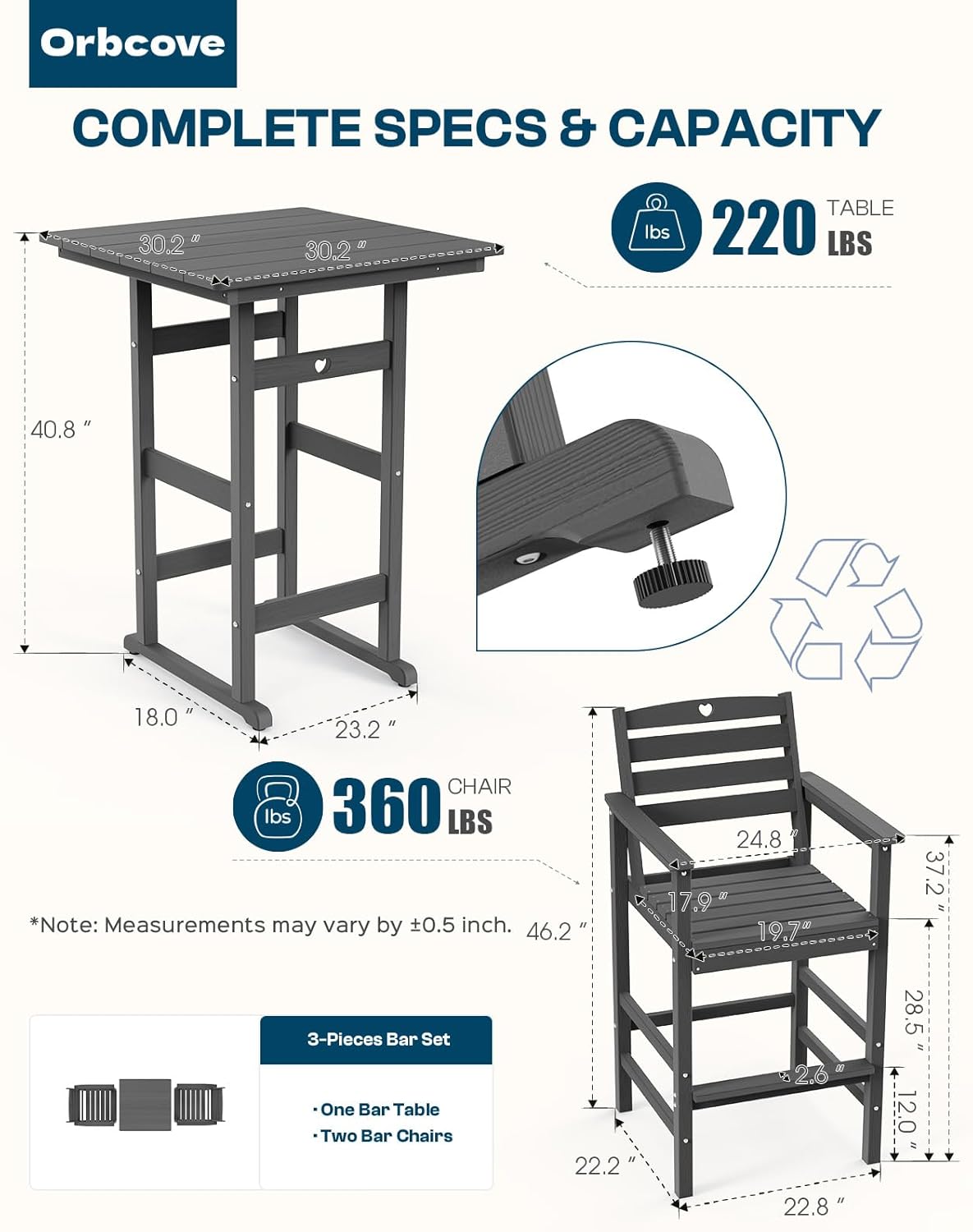 - Durable All-Weather Design: (Please note!!!Your order consists of two separate packages, which may be delivered at different times.) Crafted from HDPE with a natural wood grain finish, Orbcove bar table and chairs set withstands sun, rain, and wind without fading or cracking. Ideal for deck furniture, backyard furniture, or porch furniture, it’s perfect for year-round outdoor living.