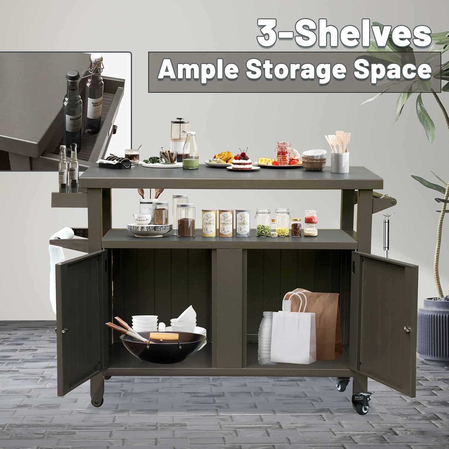 - Ample Storage Space - the outdoor grill prep cabinet table is designed with three-tie of the griddle stand which provide plenty of storage space. The open storage area offers 26 gallons, perfect for storing grilling tools and accessories. The enclosed cabinet provides 57 gallons of storage capacity, allowing for even more room for miscellaneous items