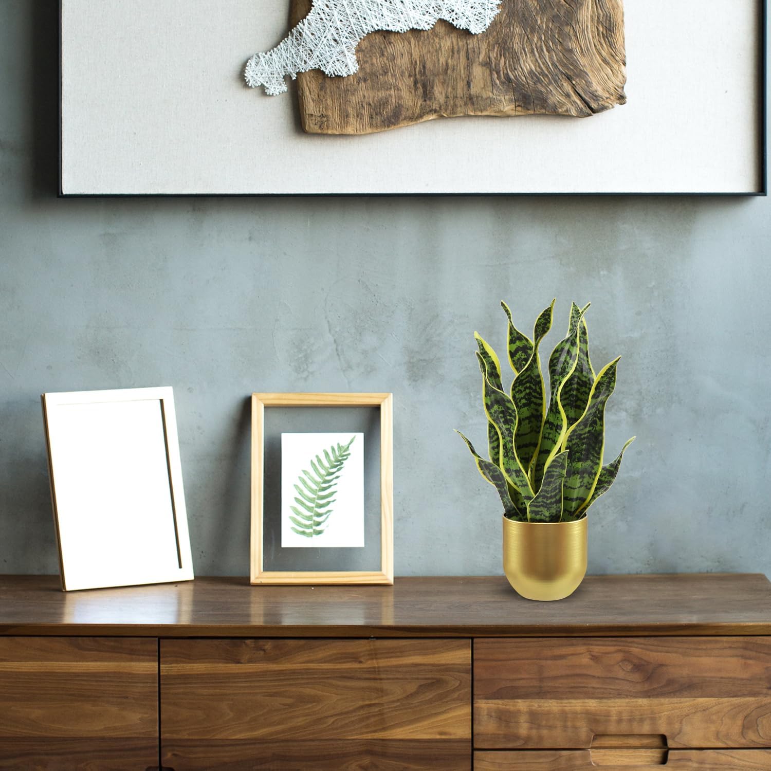 - GOOD SIZE: Large faux snake plant height height approx: 16.9", golden metal pots: 4.5"W x 4.7"H. Please read the measurement more attentively. It's a really good size for placing on a tabletop or on the floor. A golden metal planter balances the sturdy leaves with the base of the plant, simulation soil makes it looks real enough