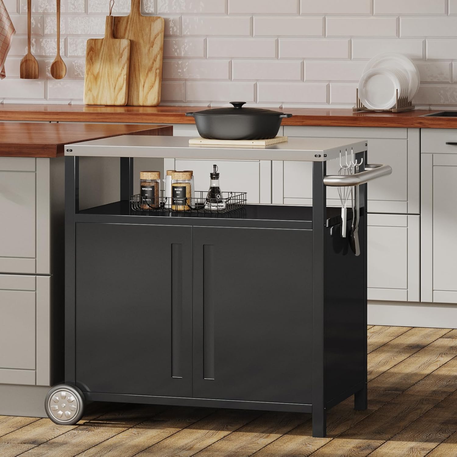 Outdoor Grill Cart with Storage Cabinet Stainless Steel Prep Stand with Storage Cabinet and Wheels Movable Whole Portable Table Outdoor Rolling Prep Station Kitchen Island Pizza Oven Table for Garden